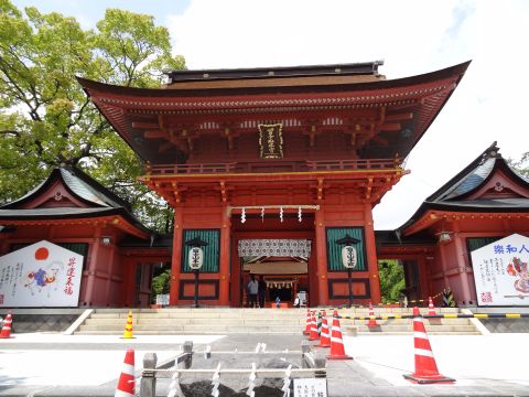 朱色の大きい鳥居をくぐり、これまた朱色の門をくぐると、目の前に立派な本殿が現れます。