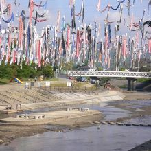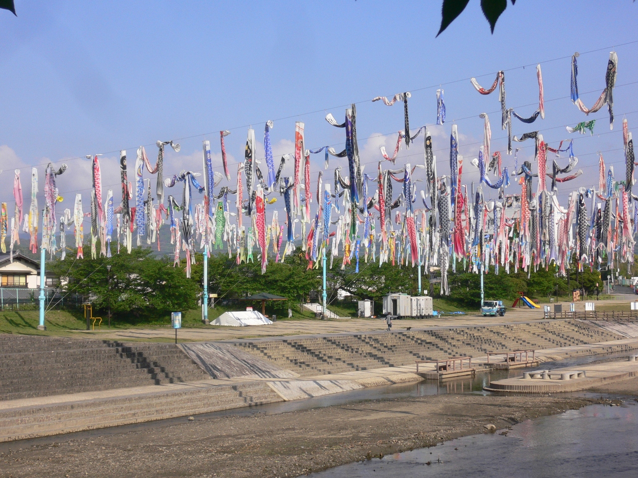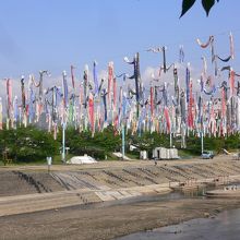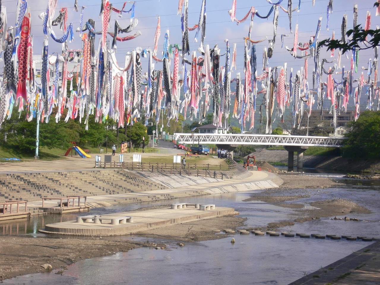 芥川桜堤にこいのぼりが1000匹風にそよいでおよいでいます。使わなくなったもの等高槻市民が持ち寄ったこいのぼりだそうです。保育園、幼稚園児などが作ったこいのぼりも見受けられかわいらしいものもありました。川面に映るこいのぼりもさわやかなものです。
