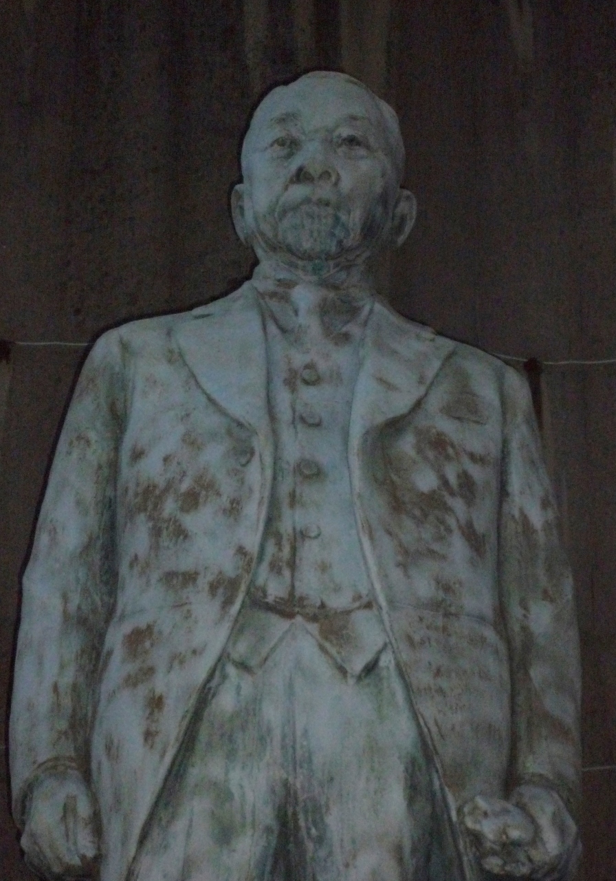 道路側から初代会頭の五代友厚、七代会頭の土居通夫、稲畑勝太郎と並んでいます。