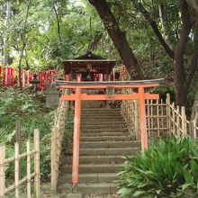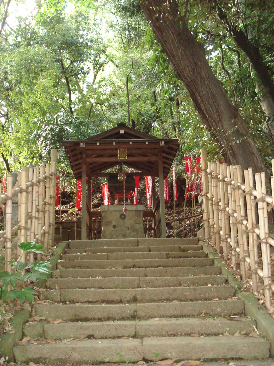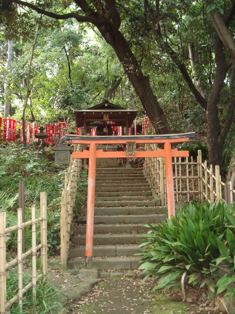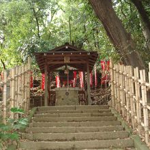 芝公園内の丸山古墳を見に行ったら、そばにあるこの神社に出会いました。小さな神社ですが朱色の山門が目に鮮やかな印象でした。
