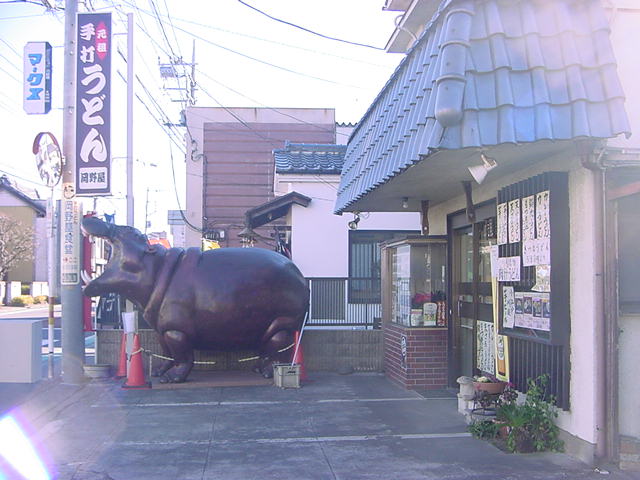 蔵の街として人気が高い川越市の菓子屋横丁に位置する食堂です。なぜか店頭には大きなカバがあって、子どもの人気を集めていました。川越名産の紫芋を使ったうどんが人気で、独特の色合いです。店内は温かい雰囲気で、観光客には絶好の立地です。