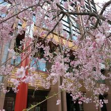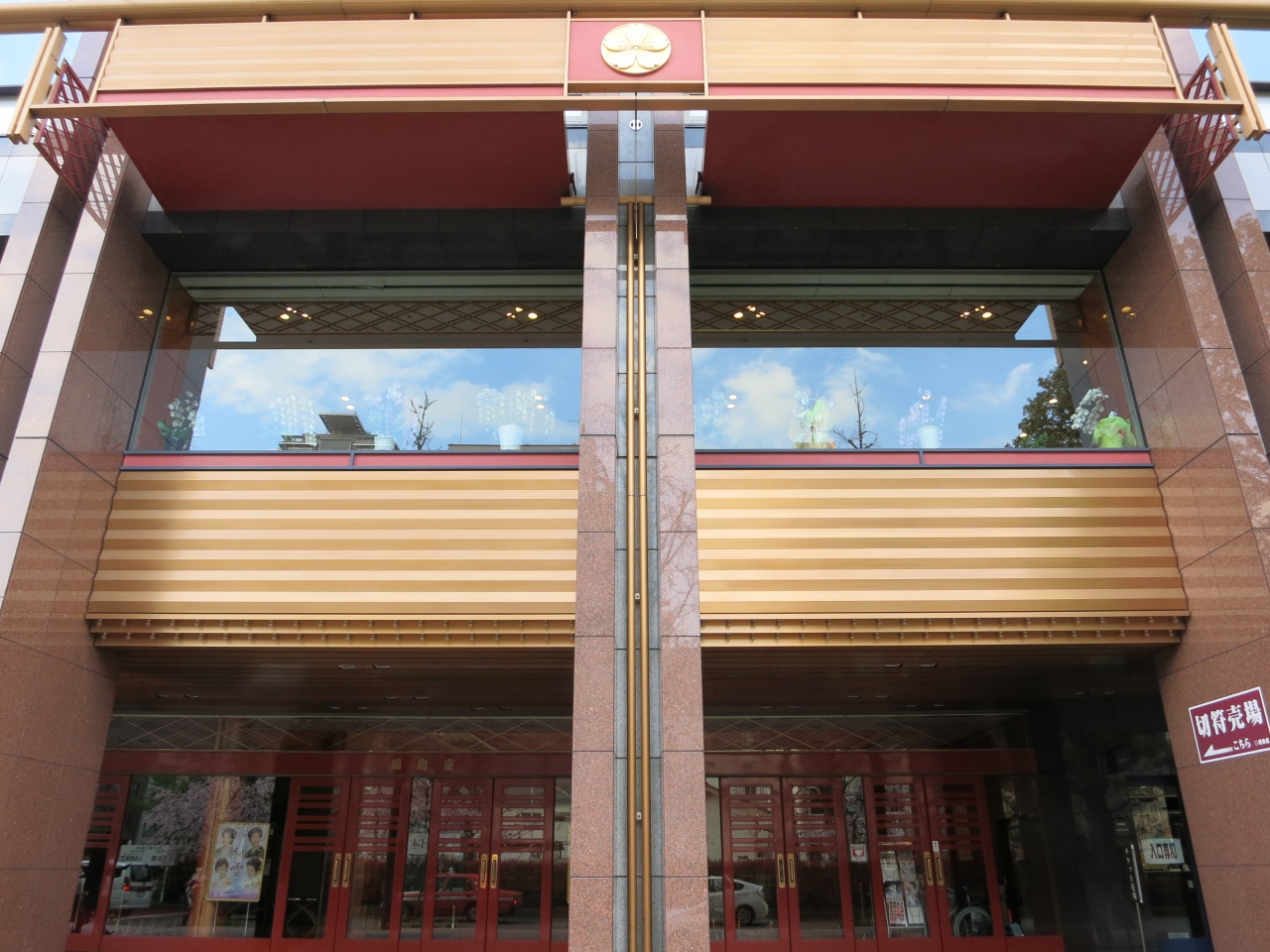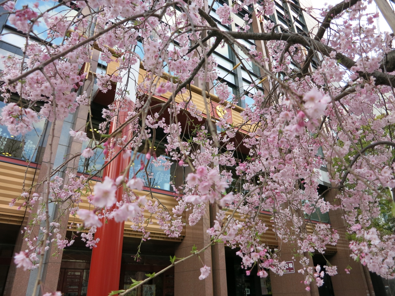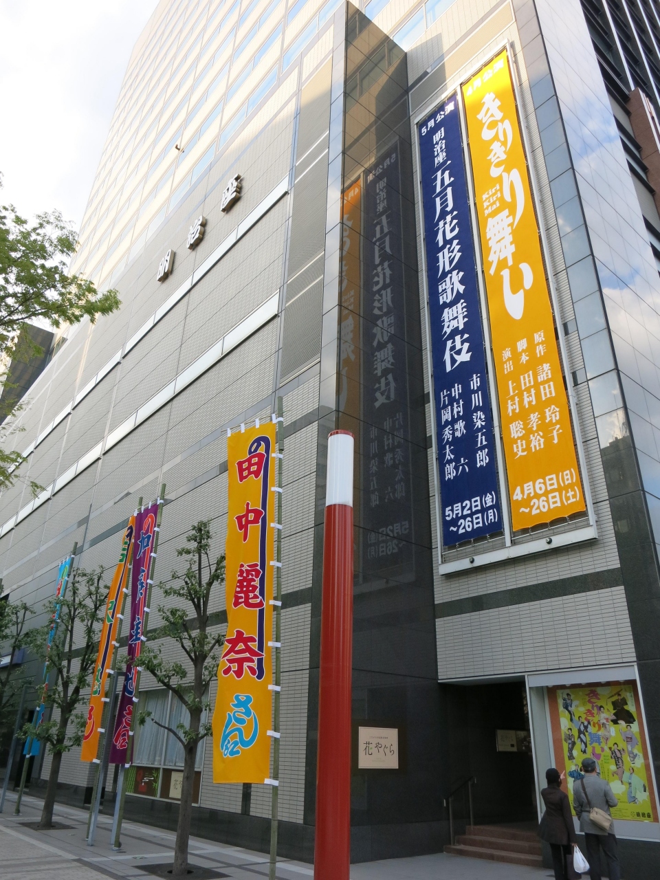 日本橋 人形町の甘酒横丁を浜町の方に進んで行くと清州橋通りを越えた左手に大きなビルが見えます。そのビルの地階に明治座があります。周辺にはしだれ桜が植えられ丁度満開で、「きりきり舞い」公演ののぼりが立ち並びきれいでした。