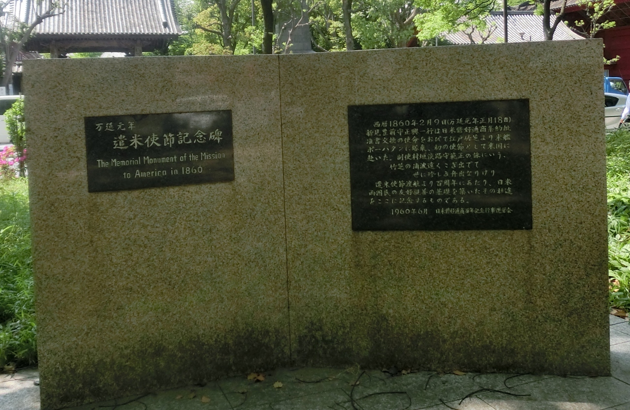この記念碑は、1860年(万延元年)、幕府は、タウンゼント・ハリス初代駐日総領事の勧めもあり、日米修好通商条約の批准書交換のため、新見豊前守正興を正使とする使節団を米国に派遣したことを記念したもの。