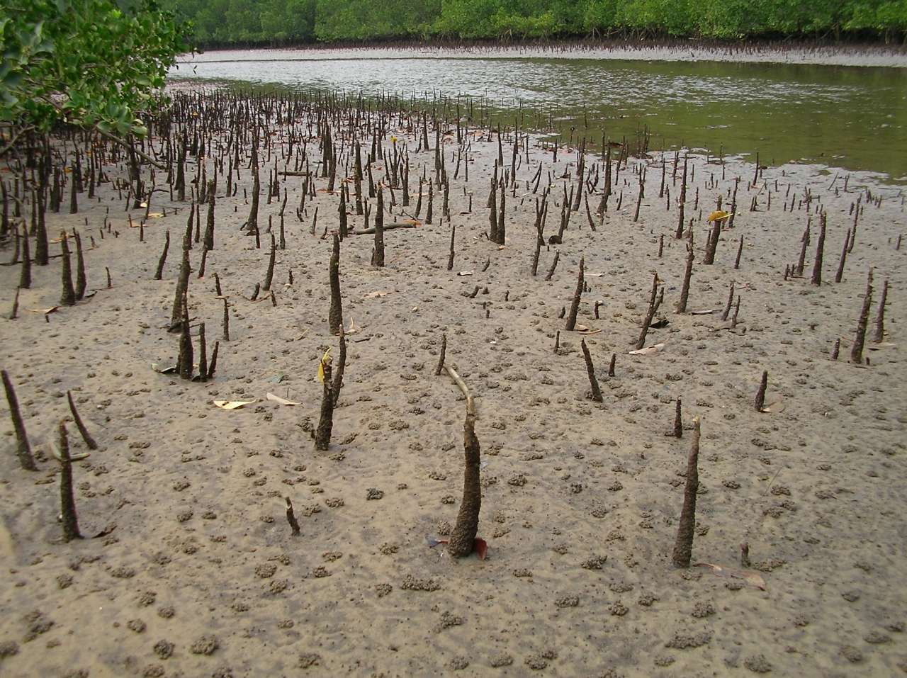 マングローブとはある植物の固有名称ではなく、熱帯や亜熱帯の河口汽水域で生育する植物の総称で、日本では沖縄県と鹿児島県に自然分布しています。西表島では、マングローブは仲間川や浦内川の流域で沢山見ることが出来ます。中でも、仲間川は甲子園球場が300個あまりも入るマングローブ林がよく発達しておりマングローブ林の面積としては我が国最大です。