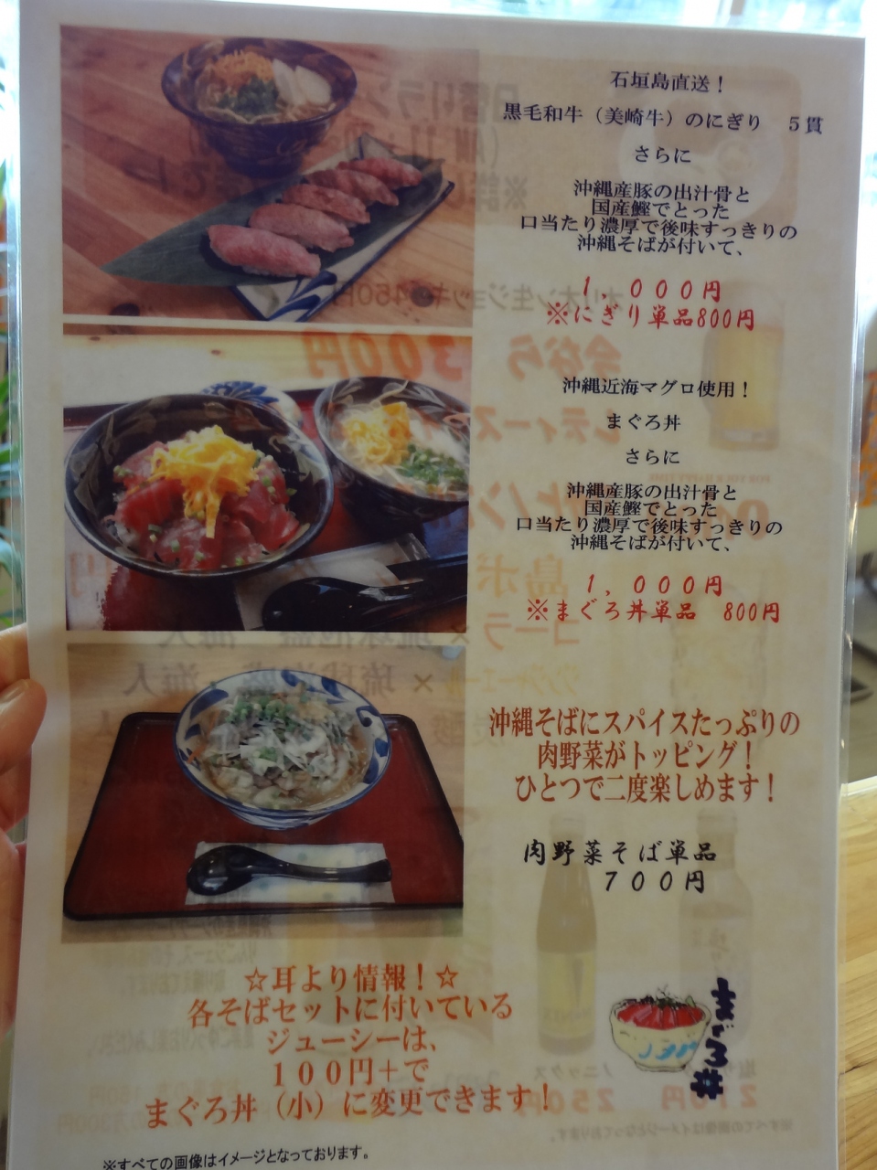 ホテルでおすすめを聞いたら教えてもらい、ランチへ。店は国際通り沿いの二階で、一階でお姉さんが呼び込みしてました。明るく広々した店内でメニューを見ると、当初薦められた500円の沖縄そばとじゅ−し−にするはずが、空腹が加担し、予算倍の牛にぎりとそばのセットにしてしまいました。後悔しつつ待ってると、思ったより小ぶりのにぎりでした。肉の甘味が添付の塩で引き立ち、スッゴク美味しかったです。そばは細めんで紅しょうがも入れてだしを味わい完食です。お姉さんがくれた紙でドリンクも飲み放題だし、とても良い店を知りました。