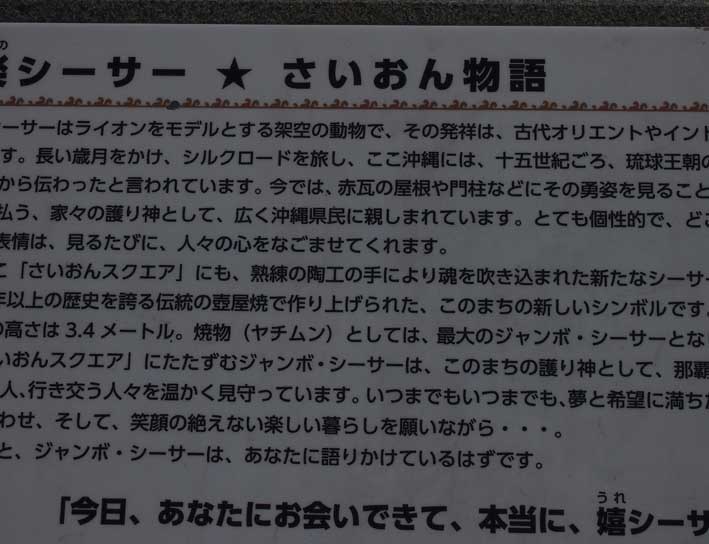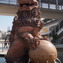 モノレール牧志駅を下車してすぐ壺屋地区の壺屋うふシーサー。観光パンフレットにも紹介されたり、今売り出し中なのでしょうか?が登場しました。足元から水が出たり工夫もありますがイマイチインパクトに欠けるかも?