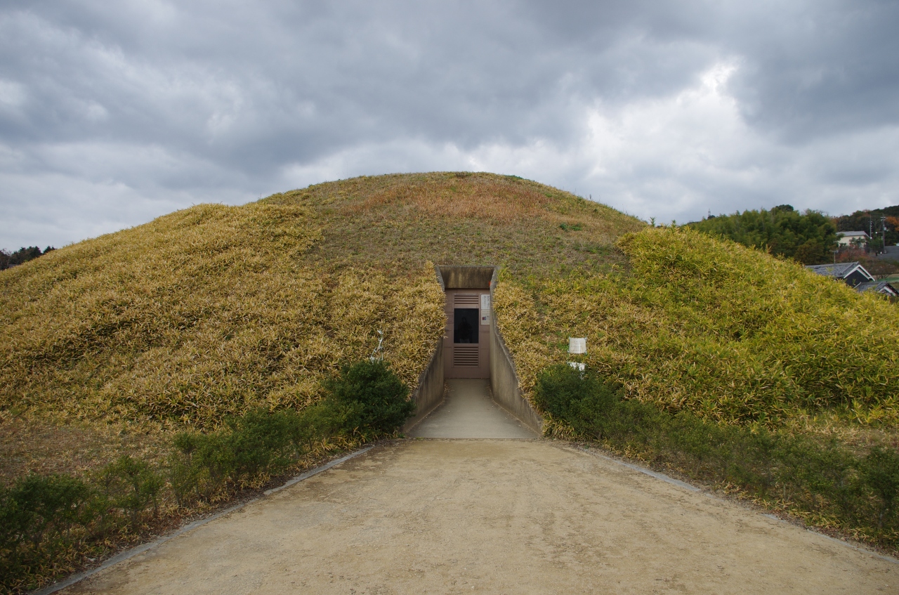 もともとは高さ9メートル、直径50メートルのお墓だったようですが、周りの水田や建物を立てる際に少しずつ削られ、今は最大径40メートル、高さ7メートル少々になっています。