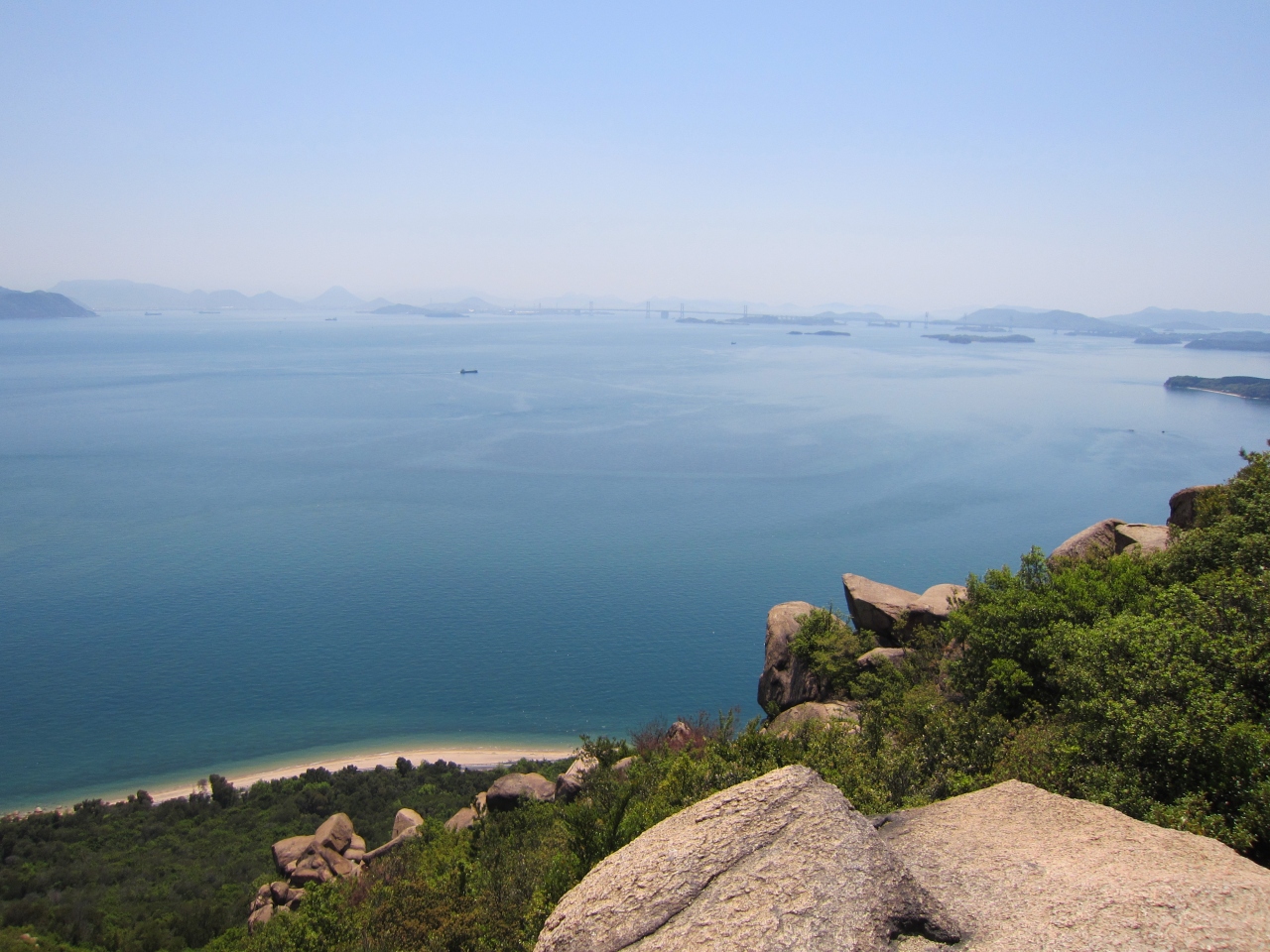頂上の岩の上からの眺めは、眼下に瀬戸内海が広がり、とても開放的です。