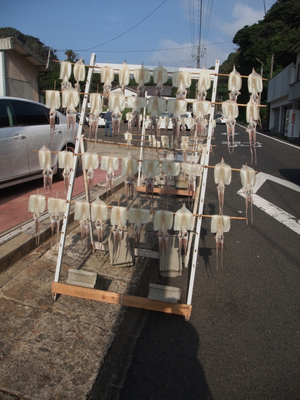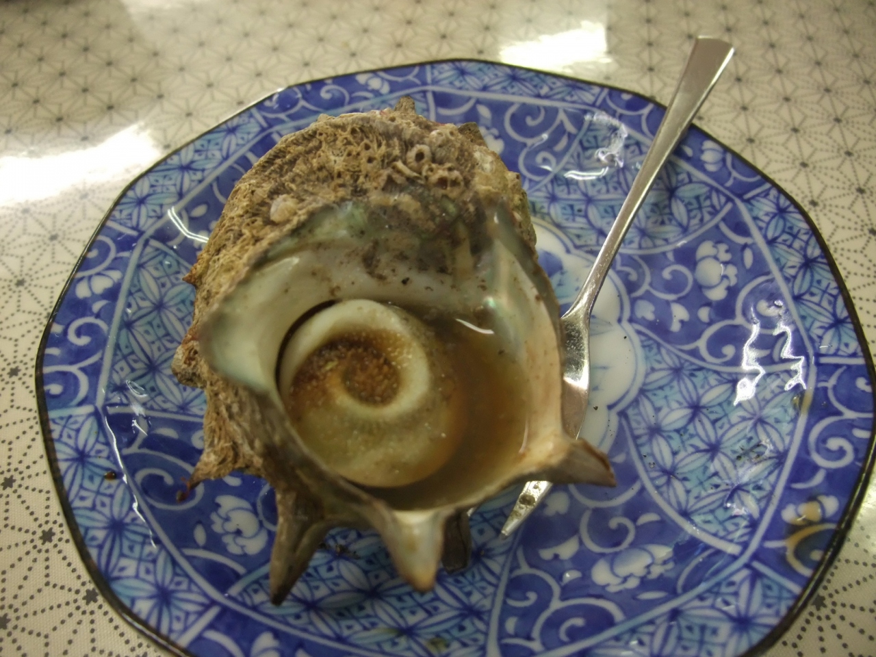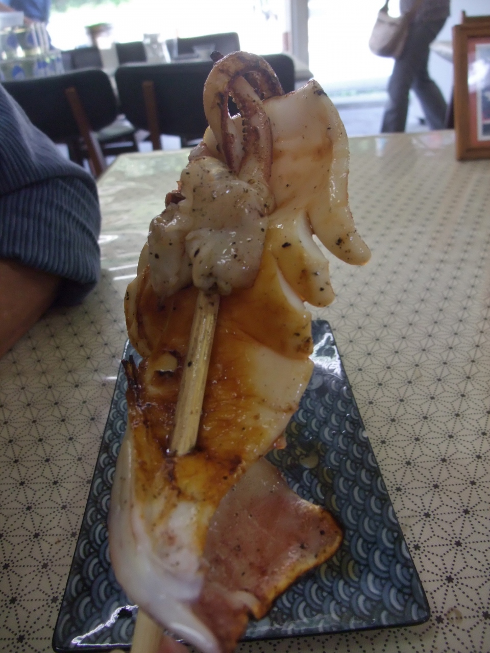 ここでは山陰の特産物、色々食べました。焼き烏賊は1本300円、焼きサザエは1個400円です。出雲そばは、色が濃く、風味が強いことで有名ですが、私が食べた割りこそばは、三段重ねになっていて700円でした。
