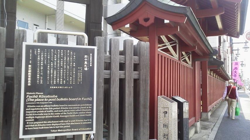 府中駅の南側からちょっと歩いて、”大國魂神社”の少し西側の旧甲州街道と府中街道の交差点にあるのがここ「高札場」。なんでも、ここは江戸時代に幕府から犯罪人などの罪状を一般庶民に知らしめる方法として、街道沿いの板に書き、人目につきやすい場所に掲げたものが”高札”であり、これを掲げた場所を「高札場」というそうです。ここは当時、甲州街道と北上する川越街道、南下する相州街道(現在の府中街道)が交差するスポットであったため、人目につきやすいため、ここに設置されたのですね。”大國魂神社”に来た際に、立ち寄ってみたらいかがでしょうか。