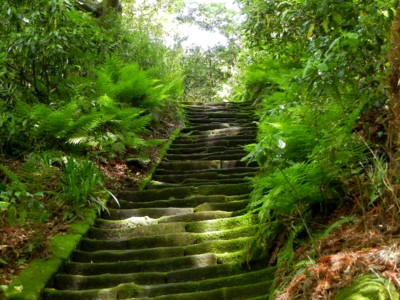 本堂に向かう石段は、苔が生し、シダの葉が大きく育ち、鶯のなく声が聞こえてきます。