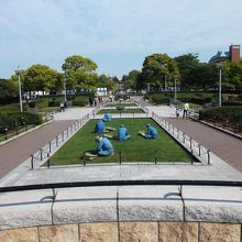 山下公園の花壇です。周りの敷地より一段低く囲った中に整頓された花木と芝・遊歩道があります。水の守護神がある中央広場とおまつり広場の間に位置しており、日米友好ガールスカウトの像の向こうに氷川丸が見えます。