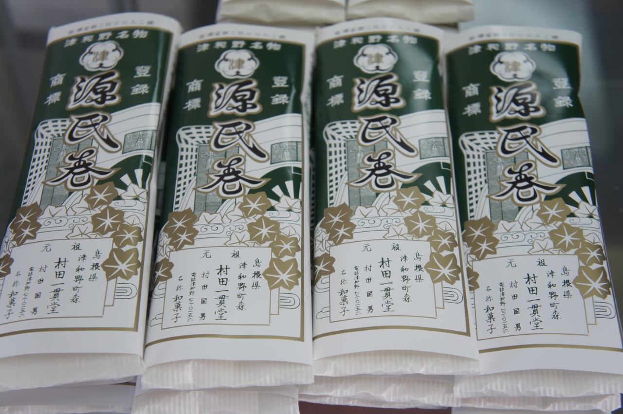 一貫堂は、三松堂本店と同じく、津和野の中心部からだと橋を渡った先のエリア。森鴎外記念館に行く途中です。源氏巻を扱う三松堂本店に比べると、正直言えば、ちょっと活気がないかも。それでも、独自の源氏巻は、薄めの柔らかいカステラ生地にしっとり餡子を挟んだ正統派です。
