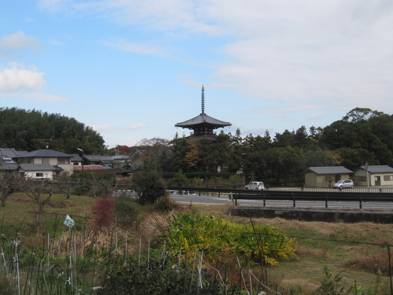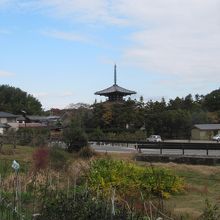 田圃から見ると、のどかな田園風景と非常によくマッチしており美しい写真を撮ることが出来る。法隆寺駅周辺からレンタサイクルで来ることが出来るが、逆に徒歩で法隆寺周辺から行くとなると距離があり大変だと思う。