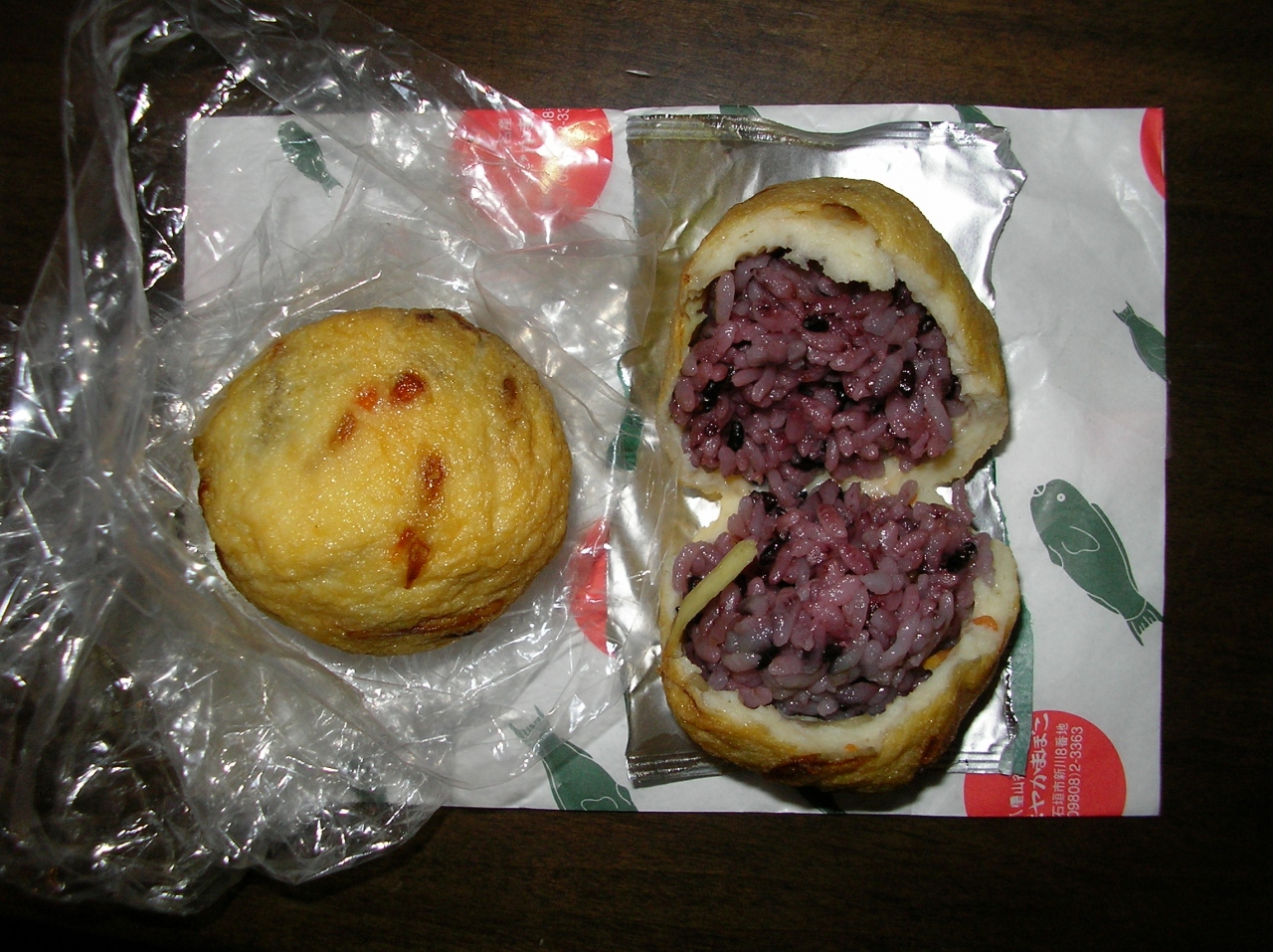 “チーズかまぼこ 110円”と、“おにぎりかまぼこ 163円”を購入して、ホテルに持ち帰って頂きました。チーズかまぼこは、かまぼこの中に小さなチーズが入っていました。おにぎりかまぼこは、かまぼこで黒紫米のじゅーしー(炊き込みご飯のようなもの)をつつんだもので、どちらも美味しくいただきました。