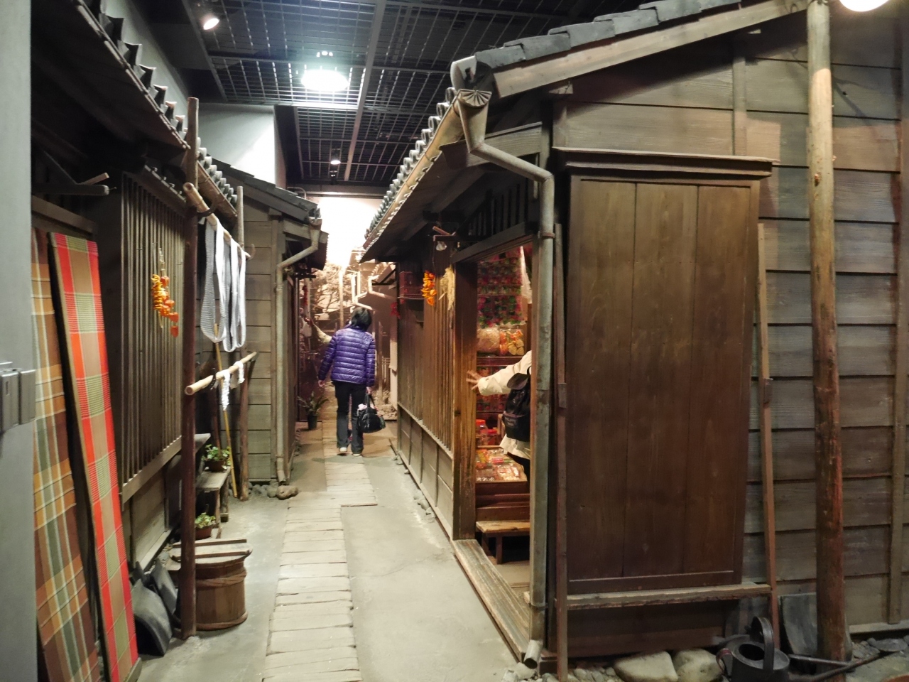 狭い路地に囲まれた裏店(うらだな)の長屋が1階に展示されています。