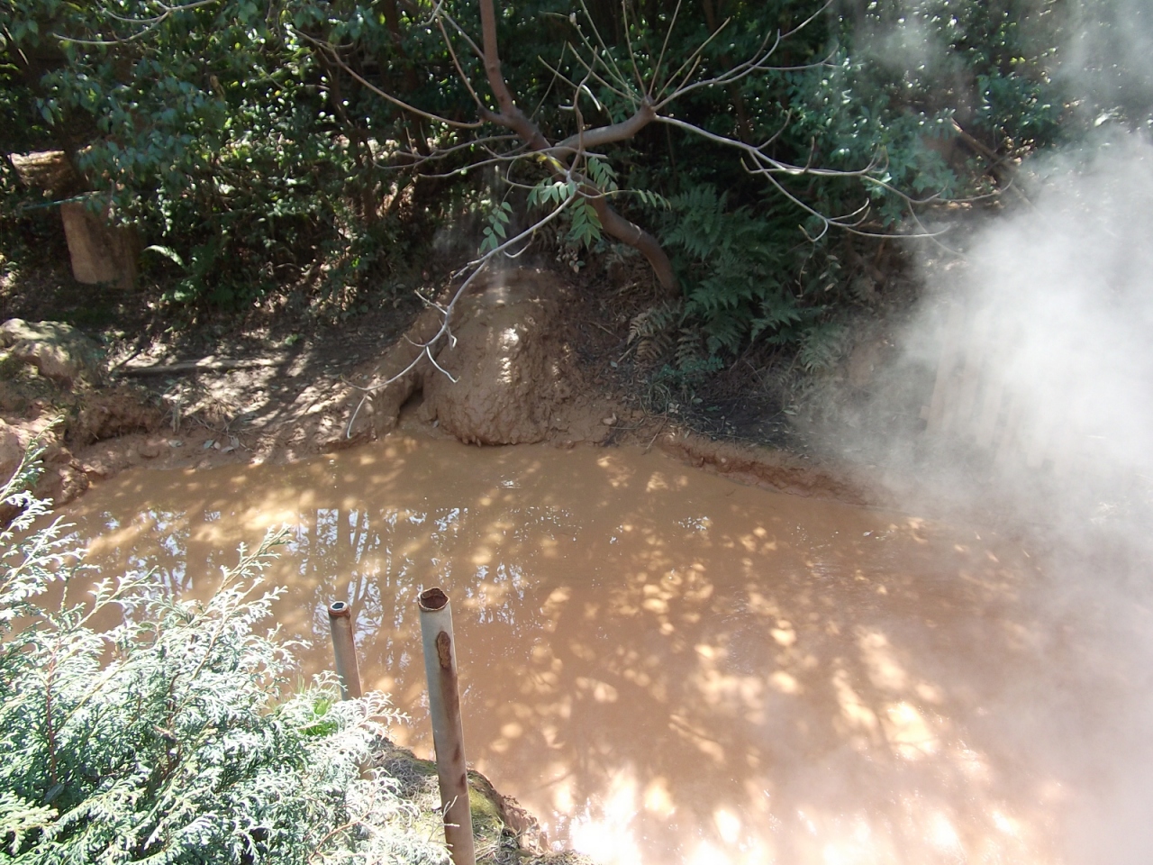 いくつかの池がある地獄で、湯面の色も入口付近は赤茶色だが、後半には海地獄のような青色がある。これは天気によって色が変わるらしい。