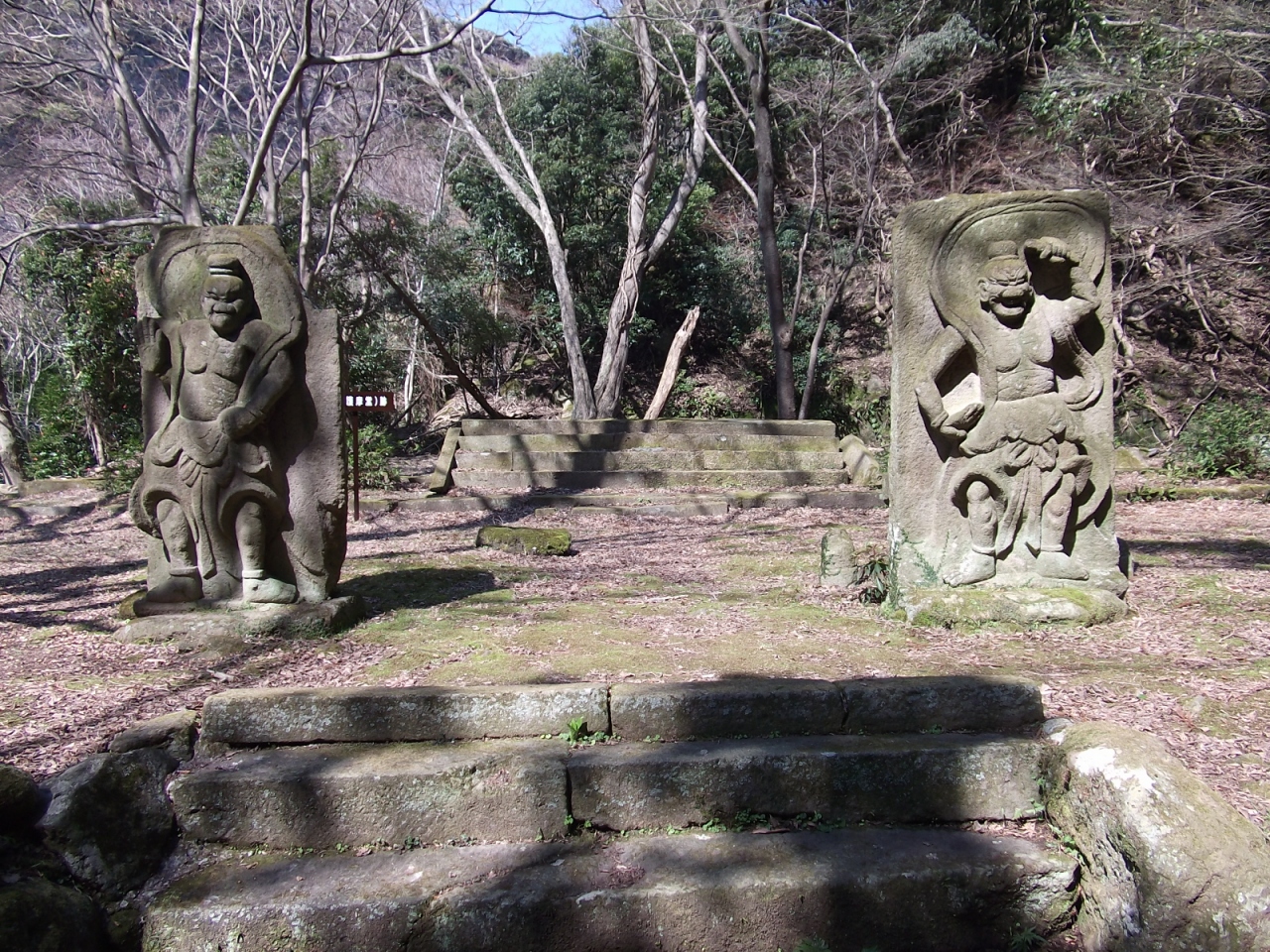 山の中には寺院があったとされる場所があり、仁王像がかろうじて残されている。