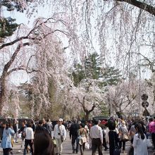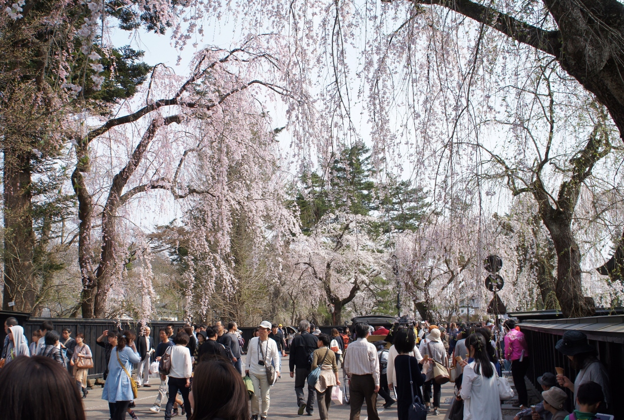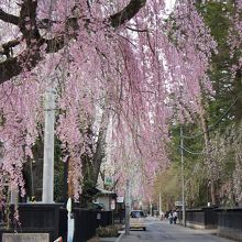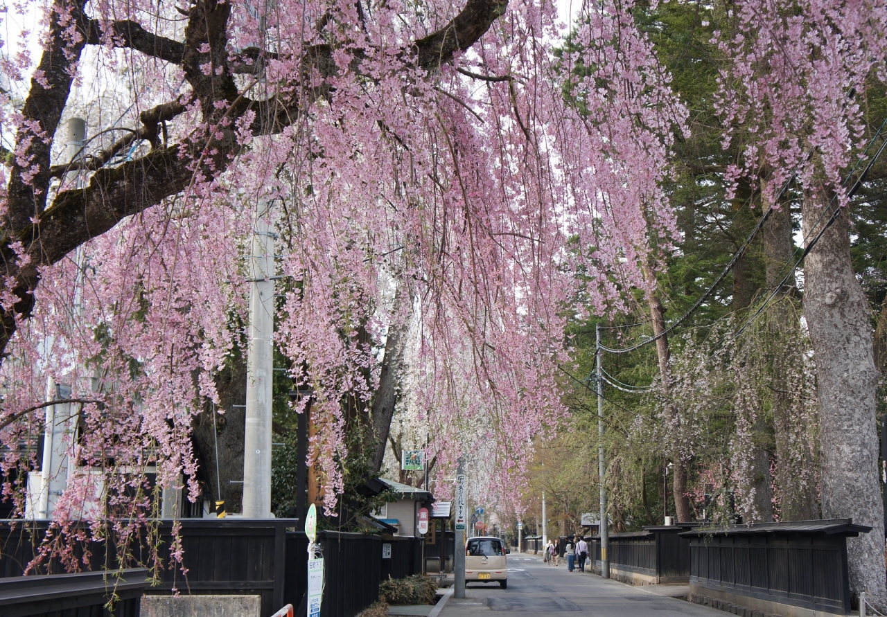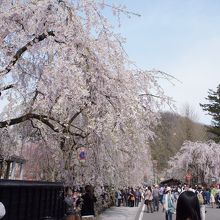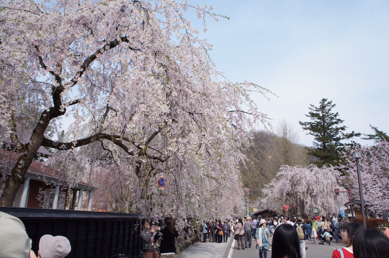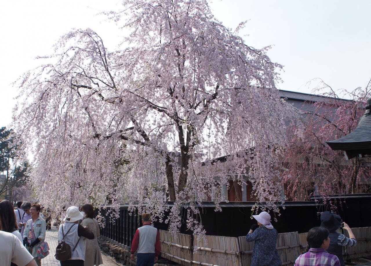 ゴールデンウイーク前半にちょうど満開で、多くの観光バスのツアーでやってきた観光客でいっぱいでしたが、約400本の桜の濃淡の色鮮やかなピンク色で黒板塀や武家屋敷を華やかに彩られ、とても綺麗でした。