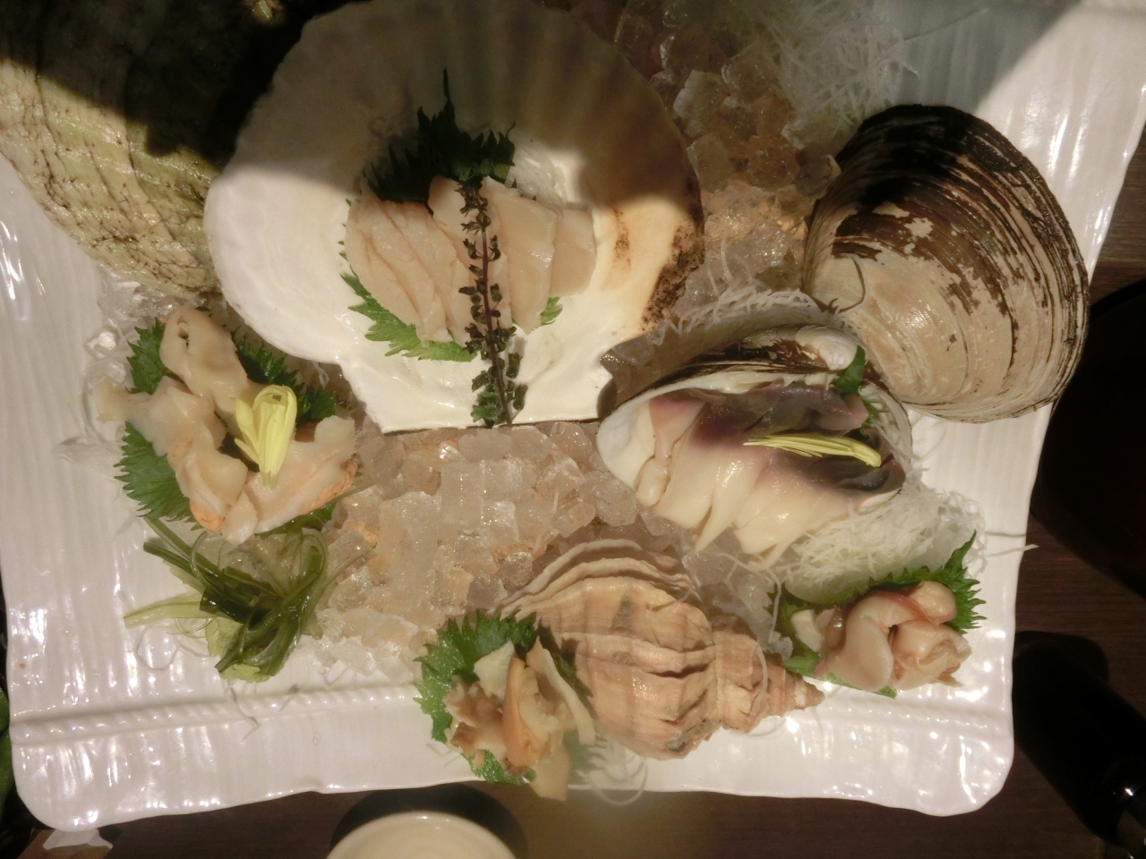 北海道らしいメニューがたくさんあるが、私が頼んだのは、貝の刺身の盛り合わせ。