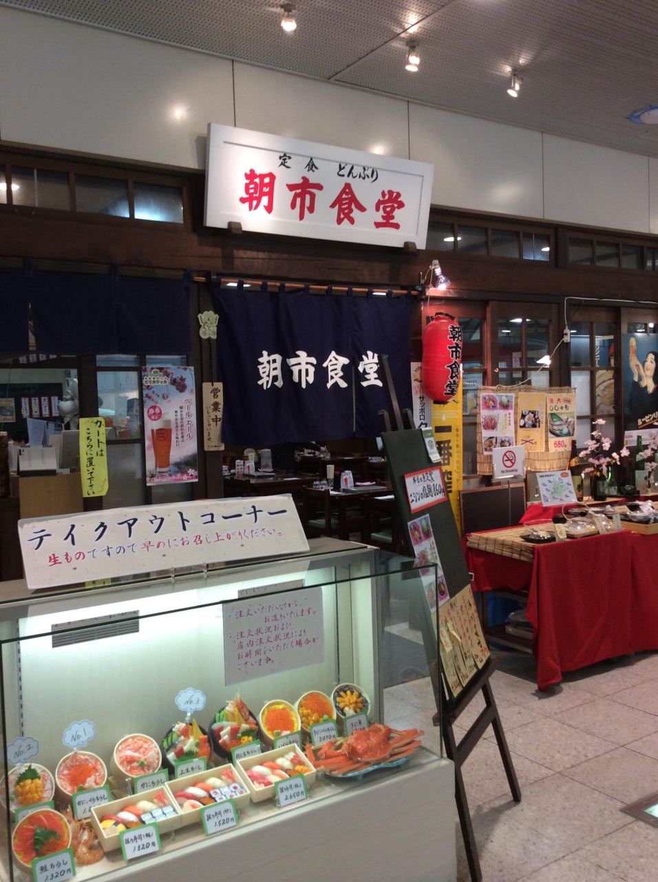 朝市食堂は、新千歳空港の到着ロビーにあります。中で食べたことはありませんが、おしゃれな外観をしたお店です。レンタカー会社のカウンターが近いので、利用するまえに注文しておけば、