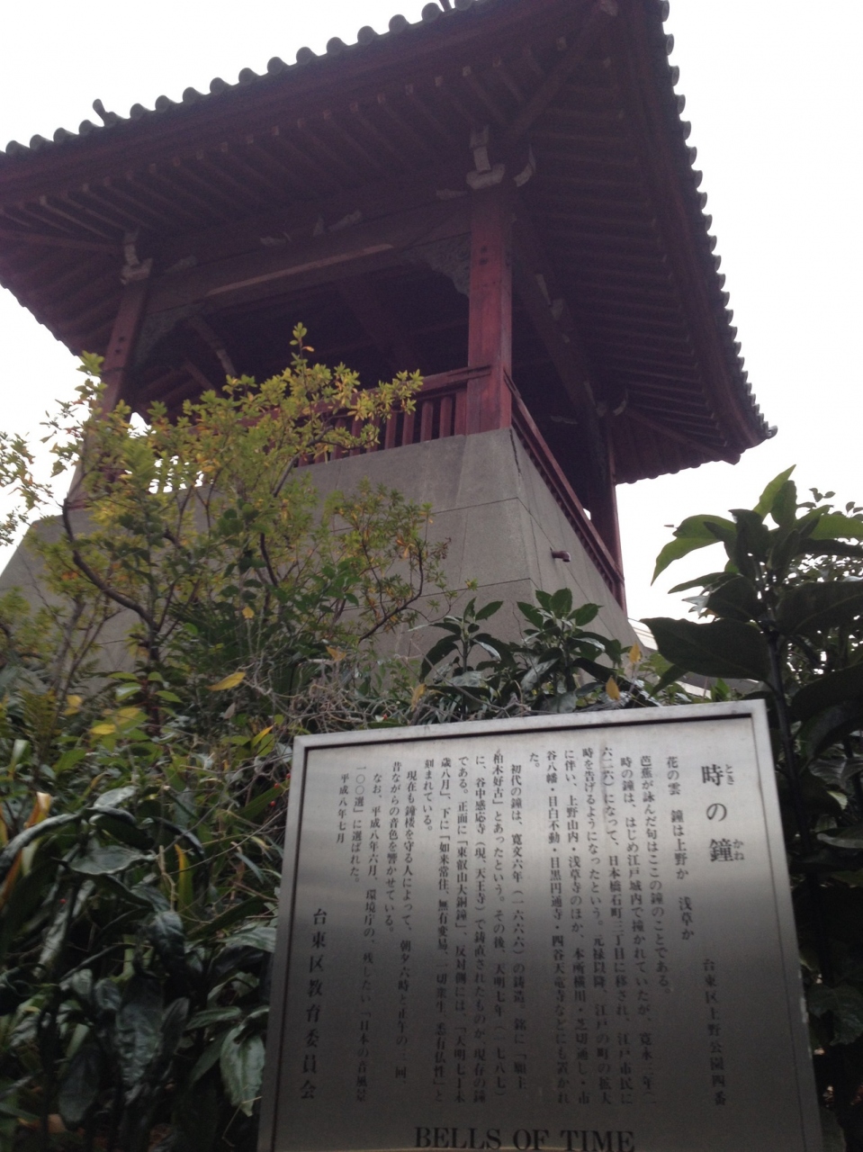 上野公園内の上野精養軒の入口脇に、1666年に設けられた鐘で、江戸の市民に時刻を知らせていた時の鐘です。当時、江戸市中には9カ所の時鐘があり、上野の鐘は松尾芭蕉に詠まれたほど江戸市民に馴染み深いもののようでした。300年以上経った今でも朝夕6時と正午の3回に鳴らしているようです。