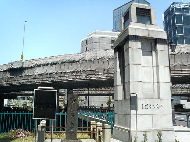 関東大震災にも耐えた橋だったのですが、首都高の建設で改修された際に、この1本以外は柱が撤去されてしまったとのこと。