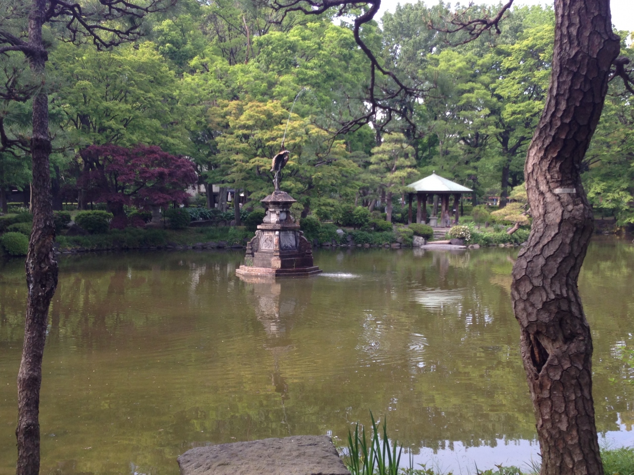 東京、日比谷公園の雲形池の真ん中に、鶴の噴水があります。