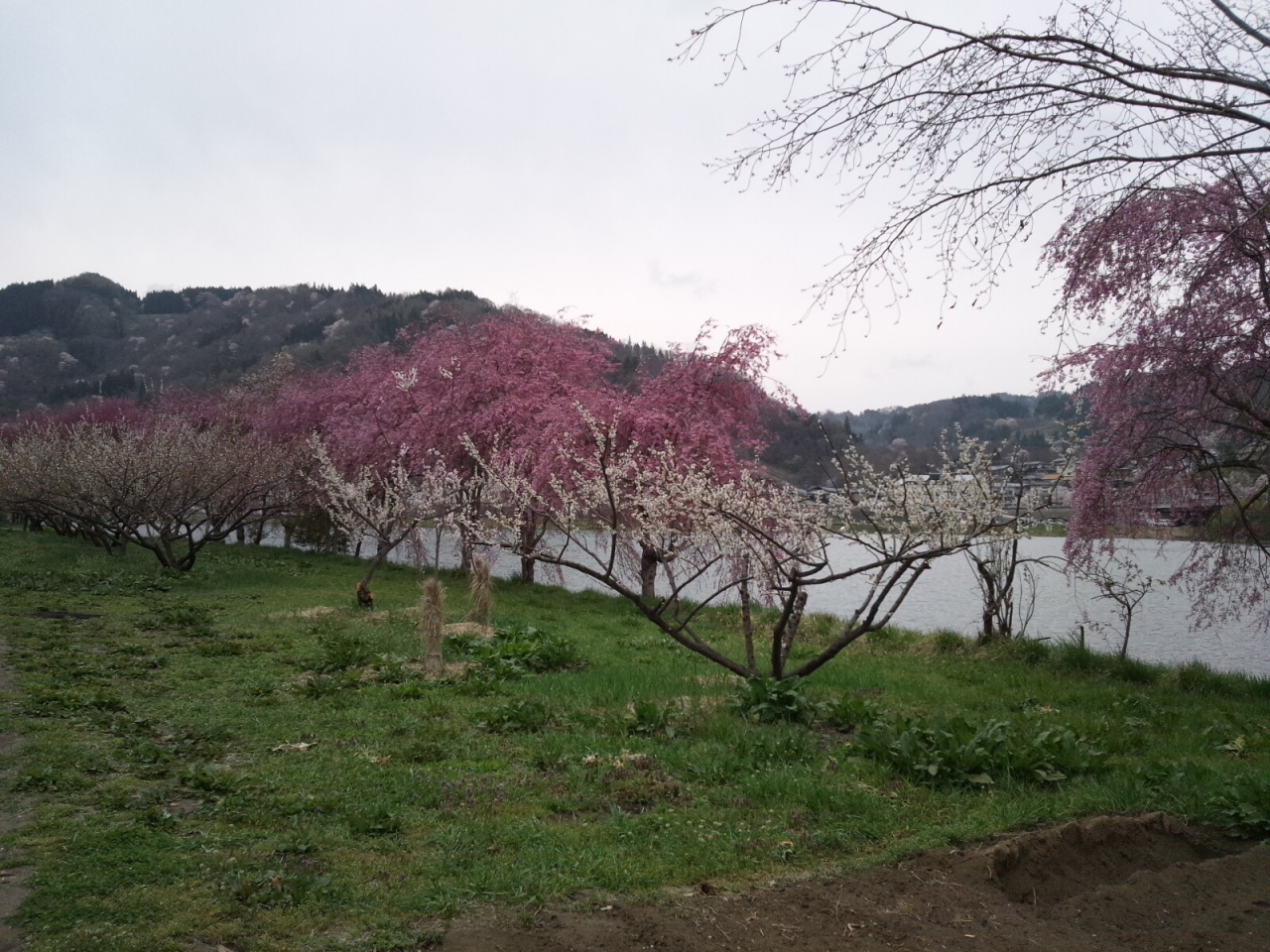 国道19号から橋を渡ると梅園があって「梅まつり」も開かれます。2014年4月22日に行ったので、もう白梅は散っていましたが、桜と紅梅が綺麗でした。夏は花火大会もあります。国道沿いには名物の「ジンギスカン」のお店が何軒かあります。