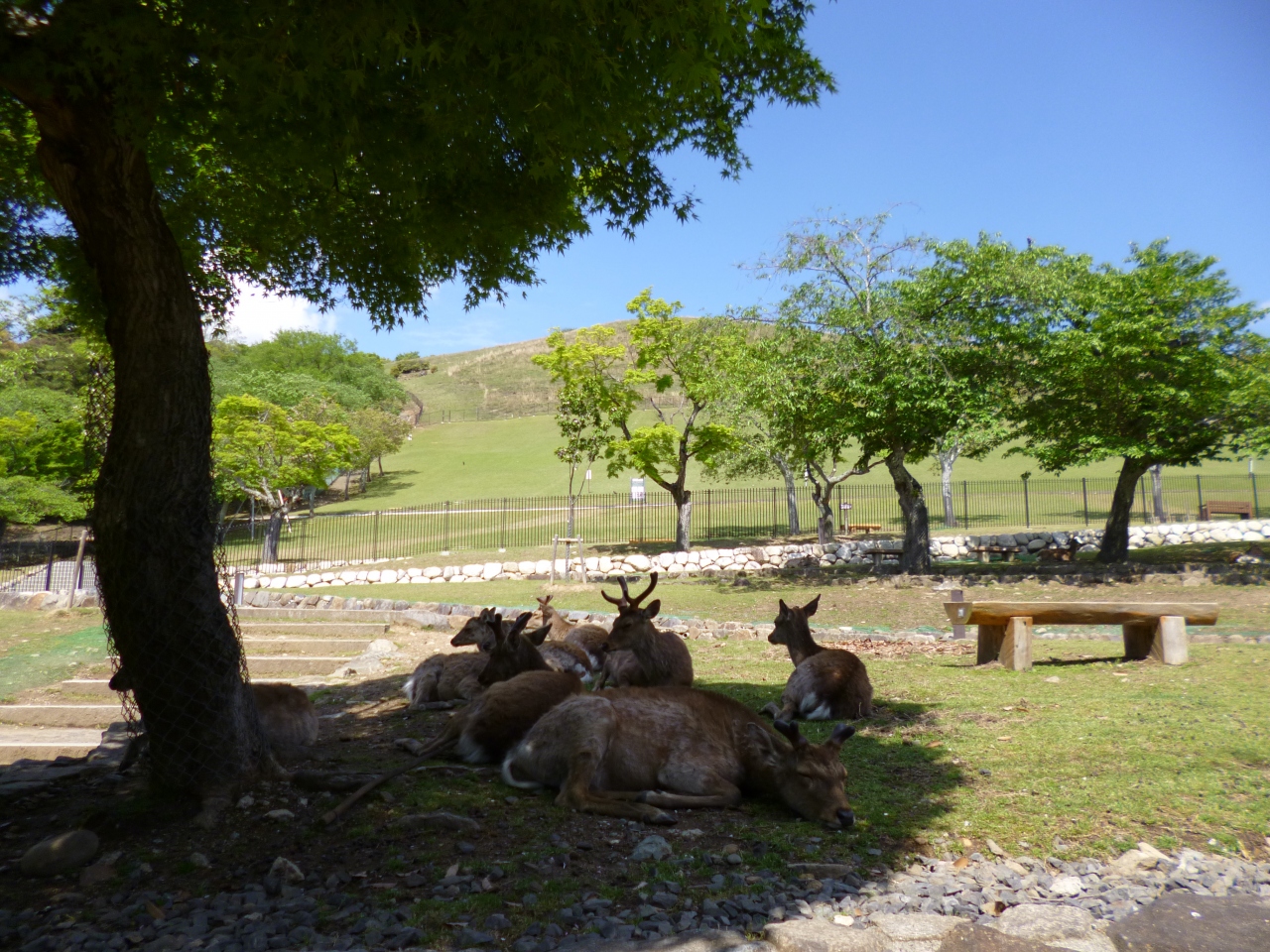若草山は奈良公園の東に位置しており全体に芝で覆われ美しい。入山料がかかり山頂まで40分位。ここにも鹿の集団が休んでいた。毎年一月にやる若草山の山焼きが有名だ。山焼き直前に大花火があがり、それから山焼きがスタートする。