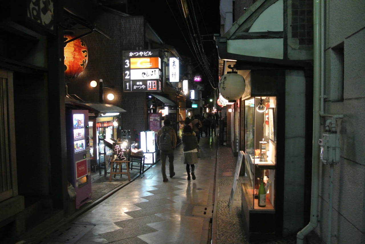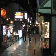 鴨川と木屋町通の間、三条通一筋下ルから四条通までの石畳の狭い通りに飲食店が並んでいて、昼より夜の方が賑わいます。