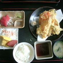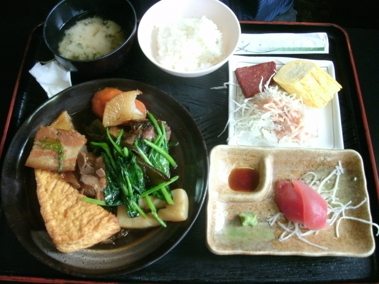 今回は、私が“煮付定食 680円”、家内が“天ぷら定食 780円”をオーダー。煮付定食はソーキ・三枚肉・蒟蒻・厚揚げ・大根・人参・青菜が入った沖縄では定番のもので、結構丁寧に造ってあり味も良かった。天プラ定食は海老2本・白身魚・野菜が数種といった内容で、沖縄風の衣がタップリものでなく、天つゆで食べる本土風のものでした。どちらも、定食なので、マグロの刺身とポーク・卵、味噌汁がついていました。