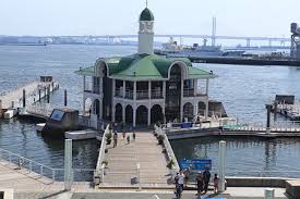 パシフィコ横浜の敷地を突っ切って海辺に行くと、時計台のようなミニチュアの城のようなかわいい建物が海に浮かんでいる。