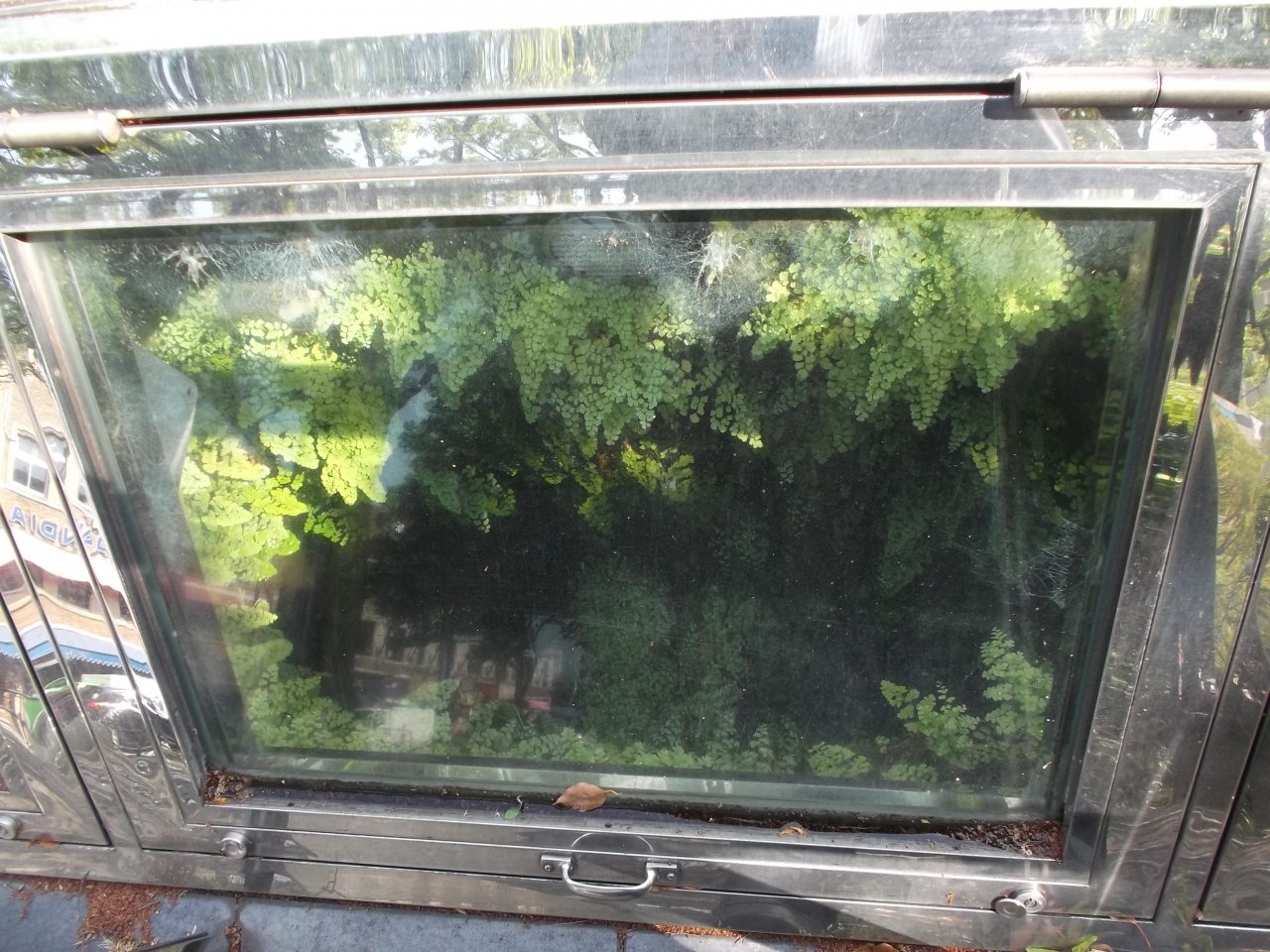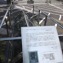「明治10年代に築造されたレンガ造りマンホールと下水管」写真解説付きエッチングのプレートがあります。その床上の三角のガラス越しに遺構をみることができます。実際覗くとよくわかりませんが・・見てみます?。