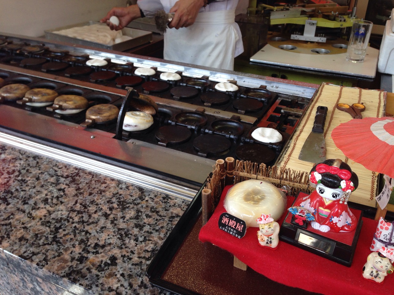 太宰府天満宮参道の中ほどにあるお店で、店先の縁台に腰掛けて熱々の梅ヶ枝餅をいただきました。お餅はお米と餡の甘い香りが湯気とともに立ち上る優しい味でした。ここの焼き器は半自動化されていて、お餅をひっくり返すパタンパタンという音が軽やかでした。