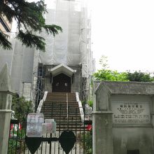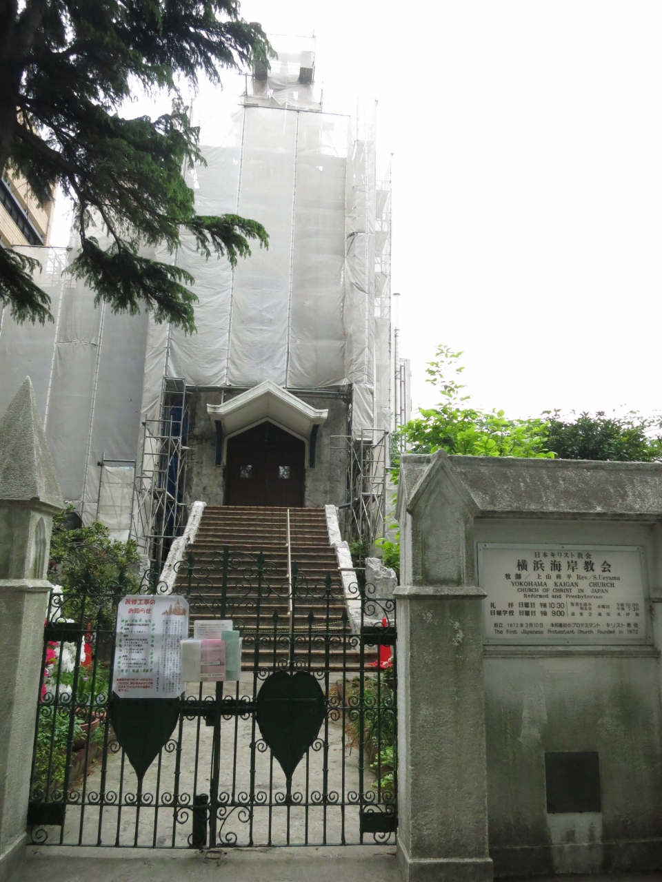 明治5(1872)年に設立された日本で最初のプロテスタント教会で、関東大震災で倒壊し、現在の教会堂は昭和8(1933)年に建てられたもので、横浜市歴史的建造物に認定されているそうです。横浜散策時に前を通りましたが、改修工事中で、残念ながら教会の姿を見ることはできませんでした。2013年10月から翌年3月までの予定だった改修工事は、さらに耐震工事も必要なことが判明し、2014年12月まで工事を延期することになったようです。お庭には「日本キリスト教会発祥の地の石碑」があるそうです。横浜散策の際には足を停めたい、横浜の歴史を感じられる場所です。