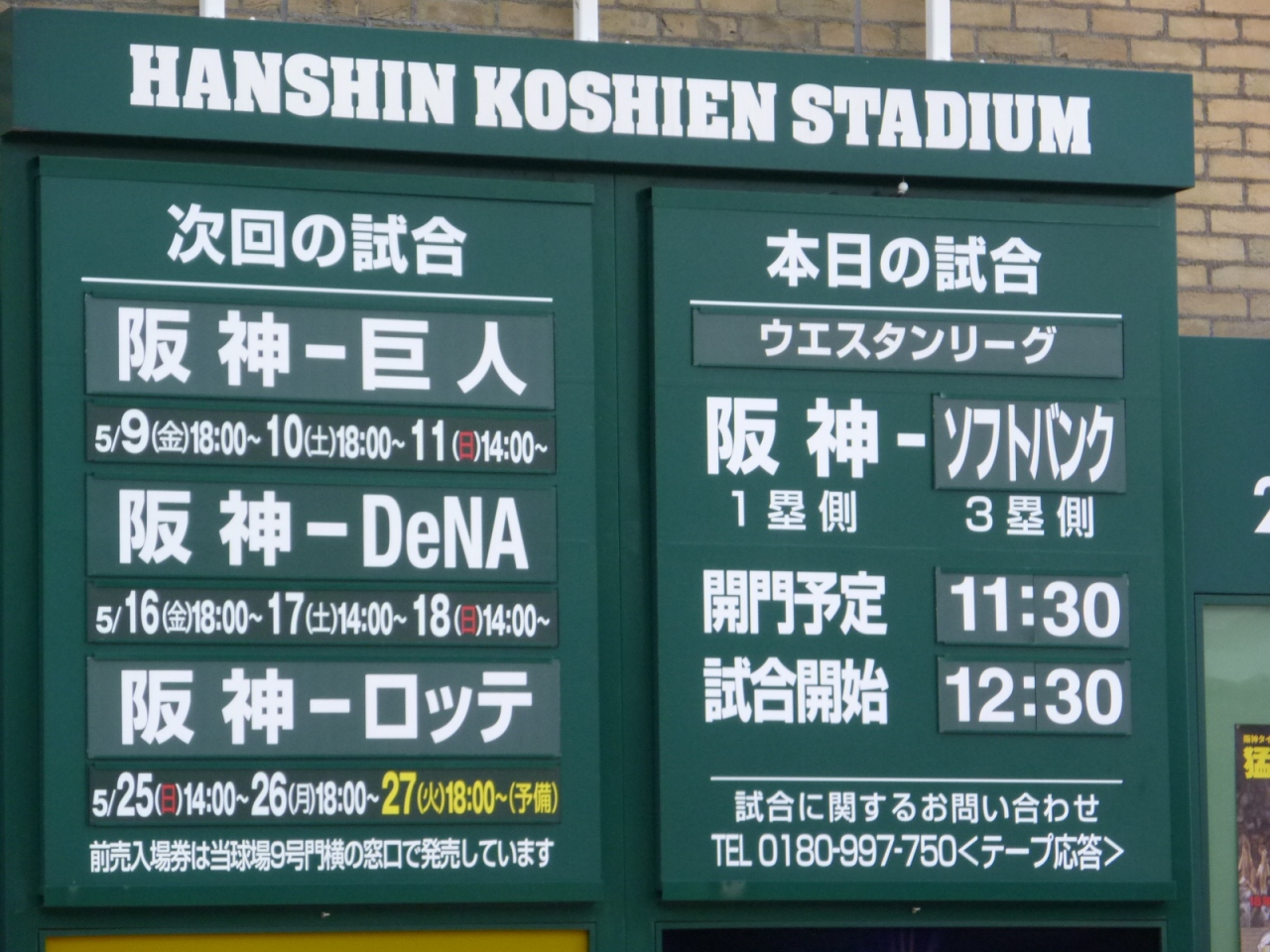 今回は甲子園での野球を期待していなかったのですが、なんとウェスタンリーグ開催中。入場料が大変お安く、良い席から観戦できるので、試しに行ってみました。一軍の試合なら見えないアングルからも安い料金で利用できたので、プロ野球に興味が無い方でも、経験してみたいというだけなら、良いと思いました。