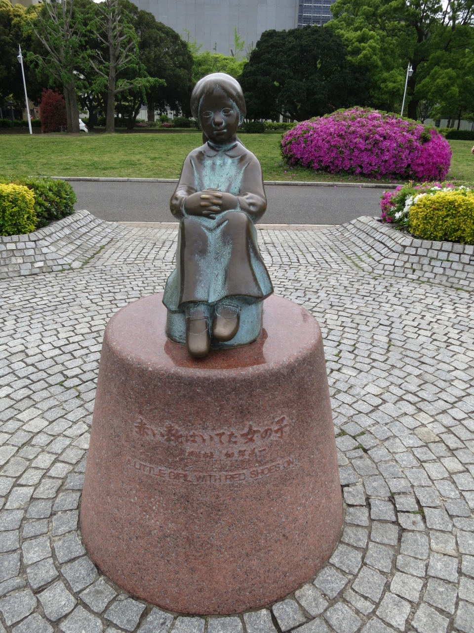 山下公園の芝生広場にある、野口雨情の作詞で有名な童謡「赤い靴」に登場する、赤い靴をはいてた女の子の銅像です。実際には叶わなかったアメリカでの暮らしを夢見ていたのか、遠く海を見つめるようなまだ幼い女の子の銅像がなんとも悲しげに映りました。昭和54(1979)年に赤い靴を愛する市民の会(赤い靴記念文化事業団)から寄贈されたもののようです。
