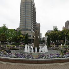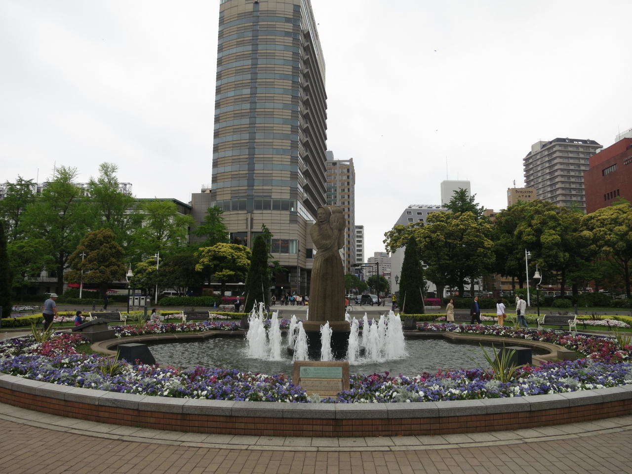 山下公園のほぼ中央に位置する噴水の中に立つ、横浜の姉妹都市サンディエゴ市から贈られた女神像です。噴水の周りは、花壇があり、周囲の緑にもよく映えて、水がめを抱えた女神像は美しく、大きく見えました。噴水の周りには、ベンチも多く、憩いの場となっていました。