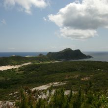 渡嘉敷港から車で20分あまり、久比里林道を経て渡嘉敷島南側にある前岳林道を進んで行くと左手にふれあい施設の園名板があります。そこから200mほどの遊歩道を進んで行くと、広い原っぱの様な園地に茸の様な形をした東屋があって、展望台からは地層の姿がむき出しになった雄大な景気を見ることが出来ます。