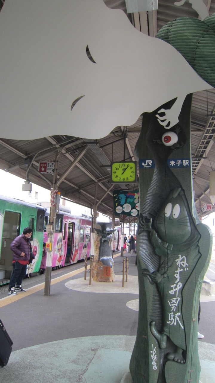 米子駅は鬼太郎列車の始発駅でもあり、ホームにはゲゲゲシリーズの仲間達がいっぱいです。