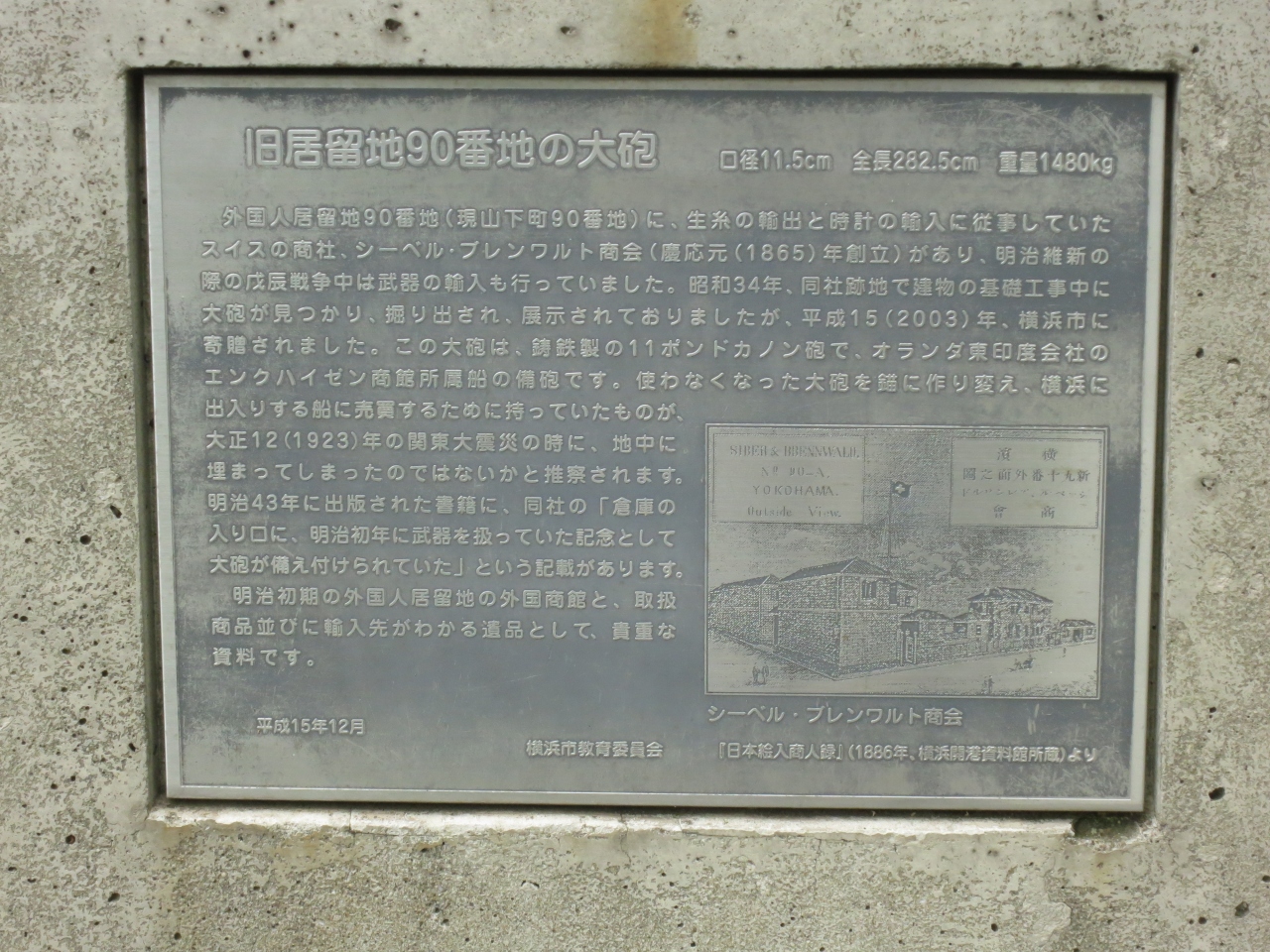 横浜開港資料館に隣接する開港広場の一角に屋外展示されています。外国人居留地90番地に、生糸の輸出と時計の輸入に従事していたスイスの商社、シーベル・ブレンワルト商会があり、明治維新の際の戊辰戦争中は武器の輸入もしていたそうです。昭和34年に、同社跡地で大砲が見つかり、平成15年に横浜市に寄贈されたもののようです。横浜散策の際には寄って見たい、横浜の歴史を感じられるスポットです。広場内には、「旧居留地90番地の大砲」の他、「日米和親条約締結の地」の記念碑や、「日米交流150周年記念植樹」「時計塔」「明治10年代に築造されたレンガ造りマンホールと下水管」などもあります。