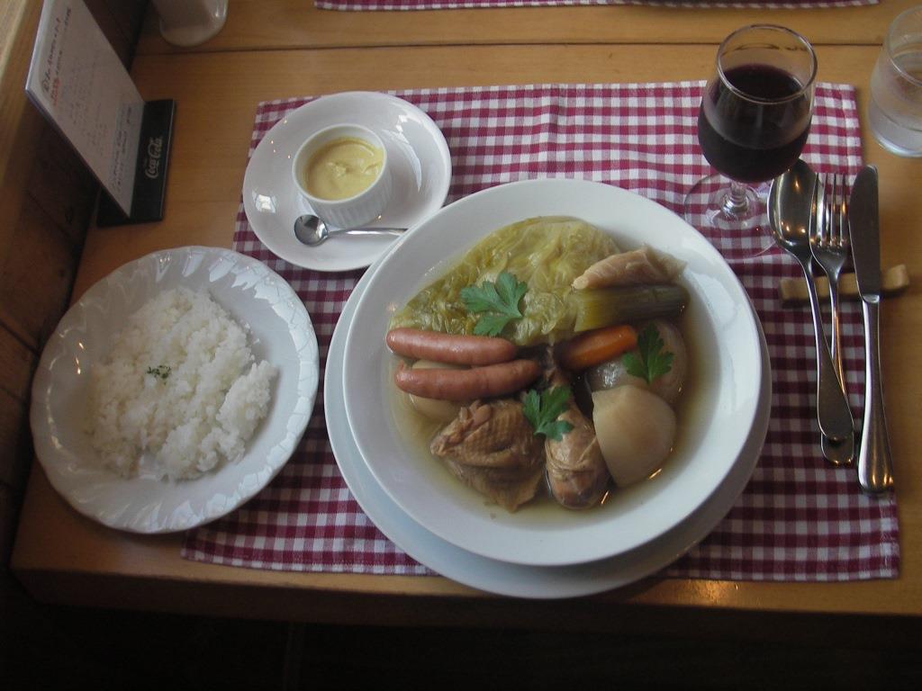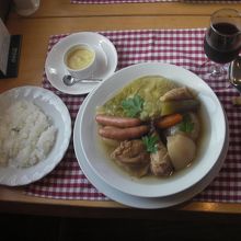 名物のポトフは、地元野菜のキャベツ、たまねぎ、じゃがいも、かぶ、セロリの他、鶏肉、ソーセージと具がたっぷりで、ボリューム満点でした。