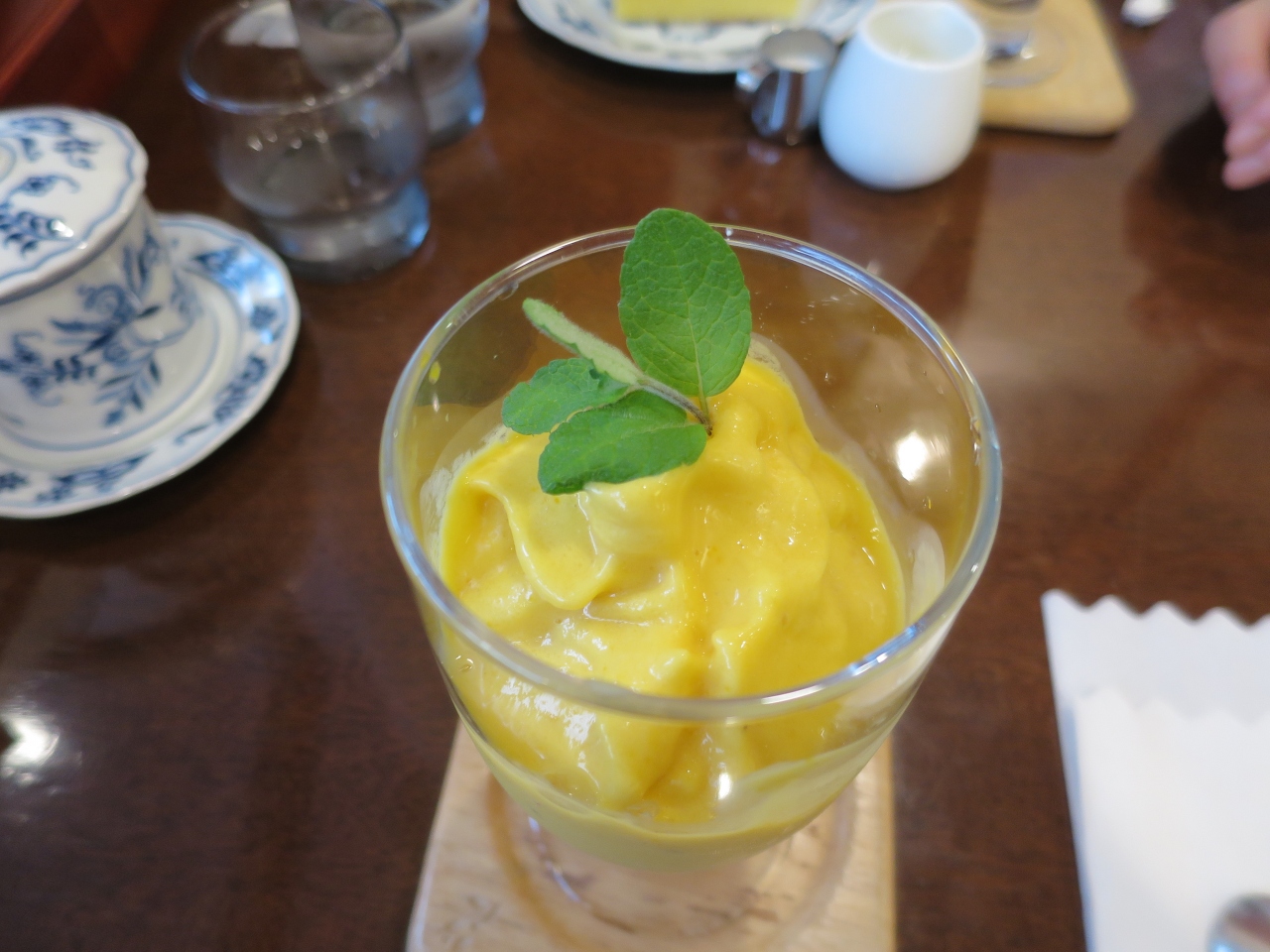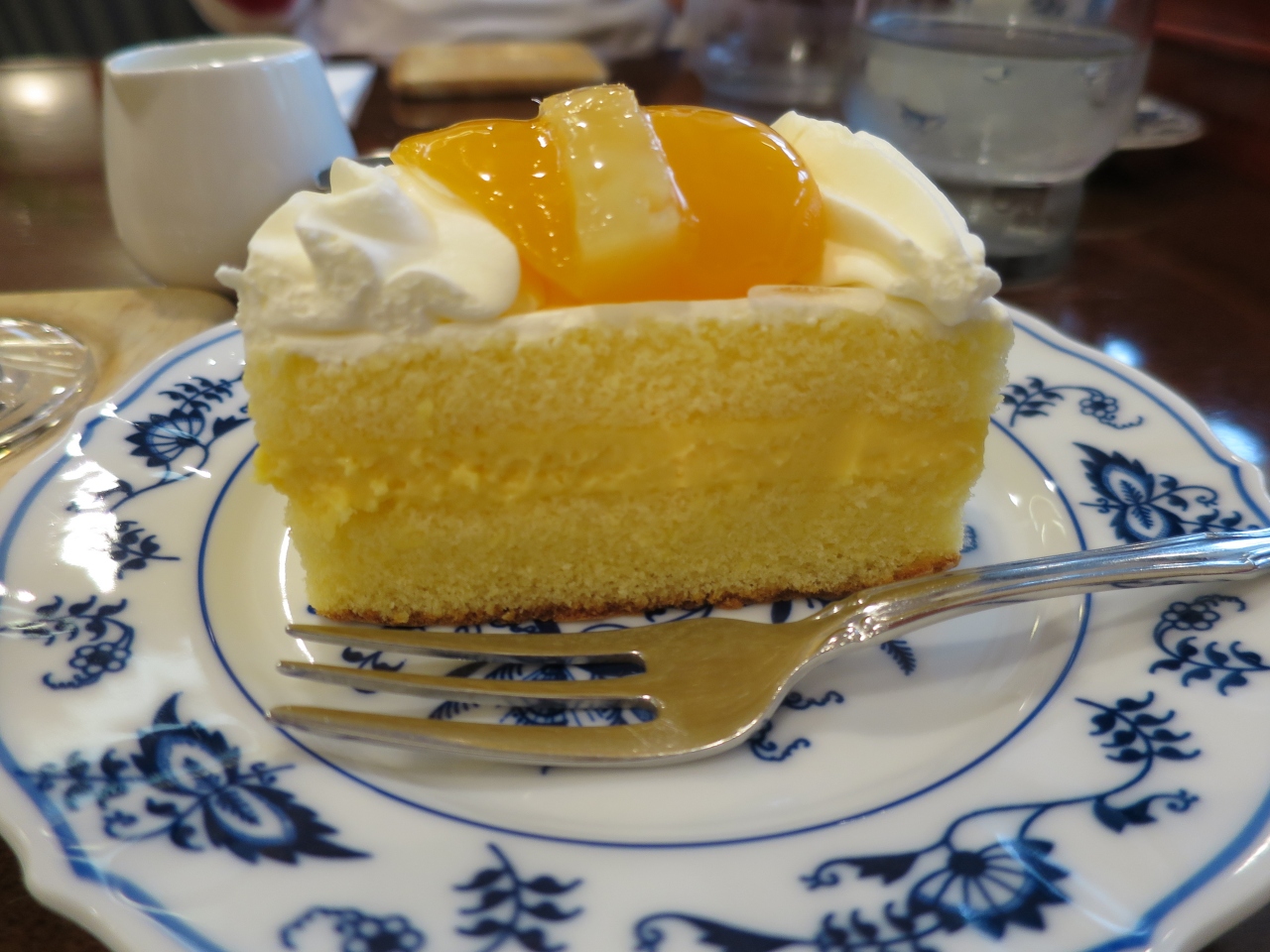 長崎では定番のケーキということで、梅月堂さん2階にある喫茶でいただきました。カステラをおもわせる生地にカスタードクリームがたっぷりはさまっていて、上には生クリーム、桃とミカンのシロップ煮がのっています。とてもシンプルなケーキなんですが、素材が良いのでしょうか、大変美味しいです。また大きさも予想以上に大きいです。甘そうなイメージですが、さっぱりとしたスポンジとクリームのせいでパクパク食べられます。カスタードクリームが特に美味しいです。別にスムージーを注文したら、ストローではなくスプーンが添えてありました。けっこう食べごたえもあり、しかも美味しかった。