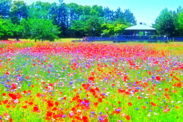 葛西臨海公園のシャレーポピーが見頃だと言うので、夏のような天気となった週末に行ってきました。 シャレーポピー(赤、紺、桃、白など)、ヤグルマギク(青、赤紫・桃・白)も混色で植えられていて見頃でした。 久々に海辺や芝生の上で裸足になって歩いてみたり潮風にあたりながら気持ちよかったです。
