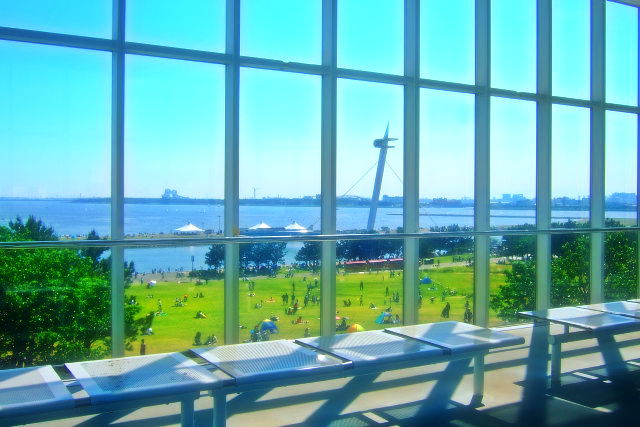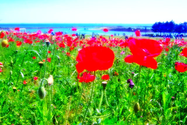 赤いシャレーポピーと 青い空と海辺と 葛西臨海公園