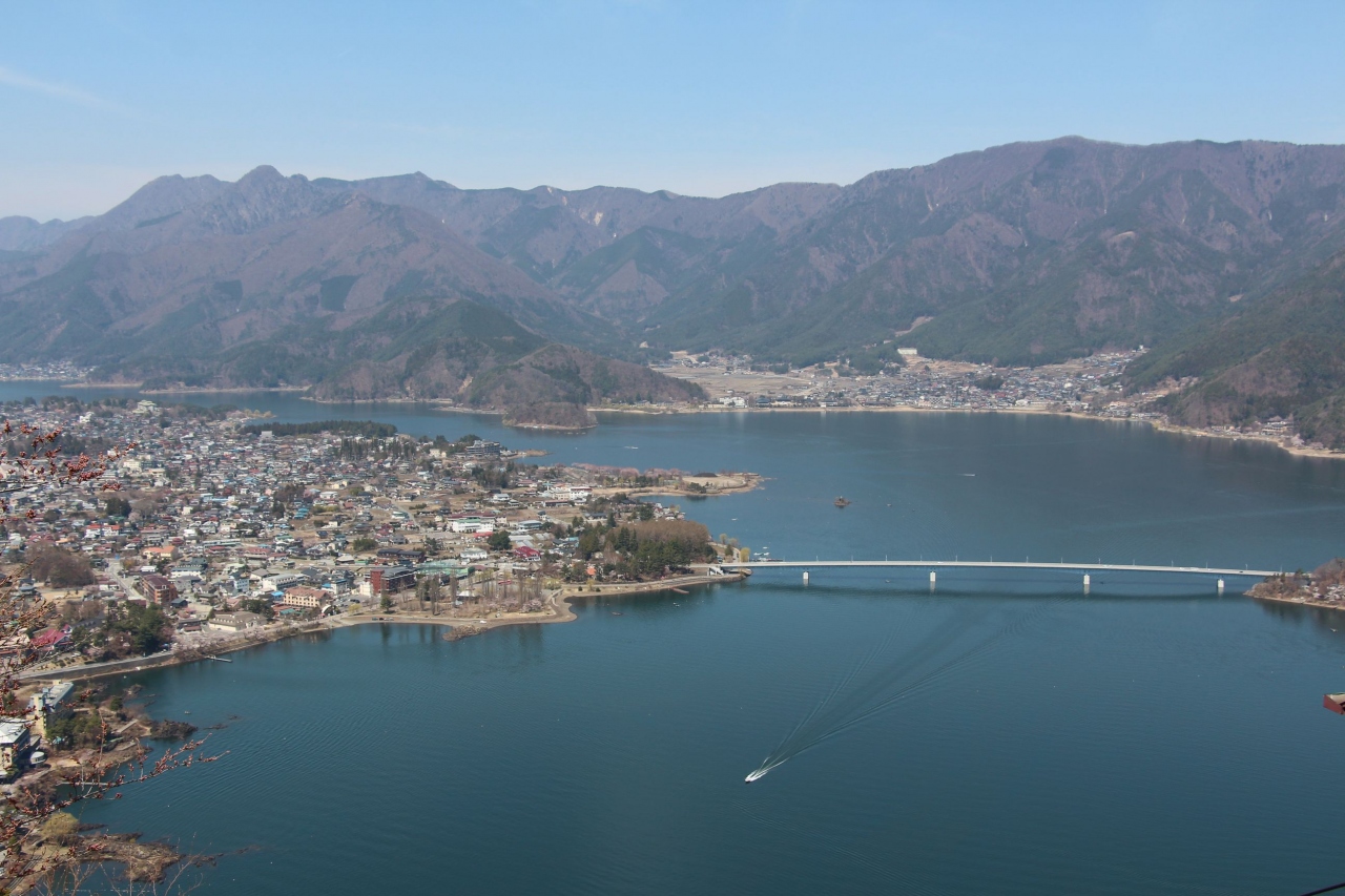 河口湖北岸の「産屋ケ崎」から南岸の「梨宮公園」に