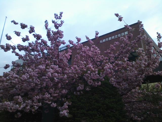 ここは札幌市内で伝統芸能関連のイベントが開催される時などによく使用される場所ですが、地元では、建物の両側、特に向かって右手に並ぶ八重桜の開花が見事なことで知られています。中央部には一応ソメイヨシノもありますが、こちらは早めに散ってしまいます。それにしばらく遅れて、大体例年5月半ば頃に、濃ピンクの見事な花を咲かせますが、丁度咲き始めたライラックとのコラボが楽しめたりもしますので、是非時期を合わせて見に行って頂きたく思います。