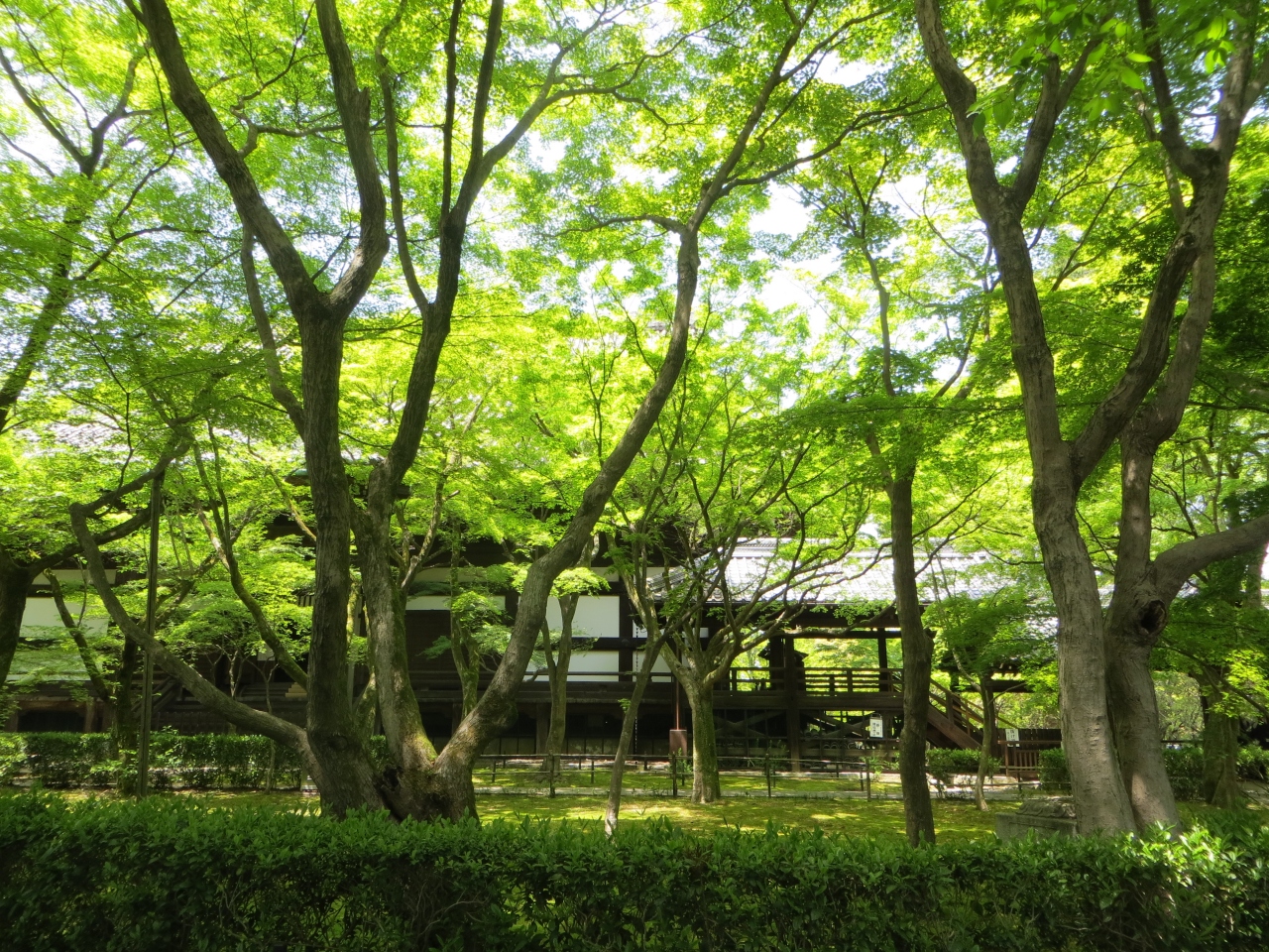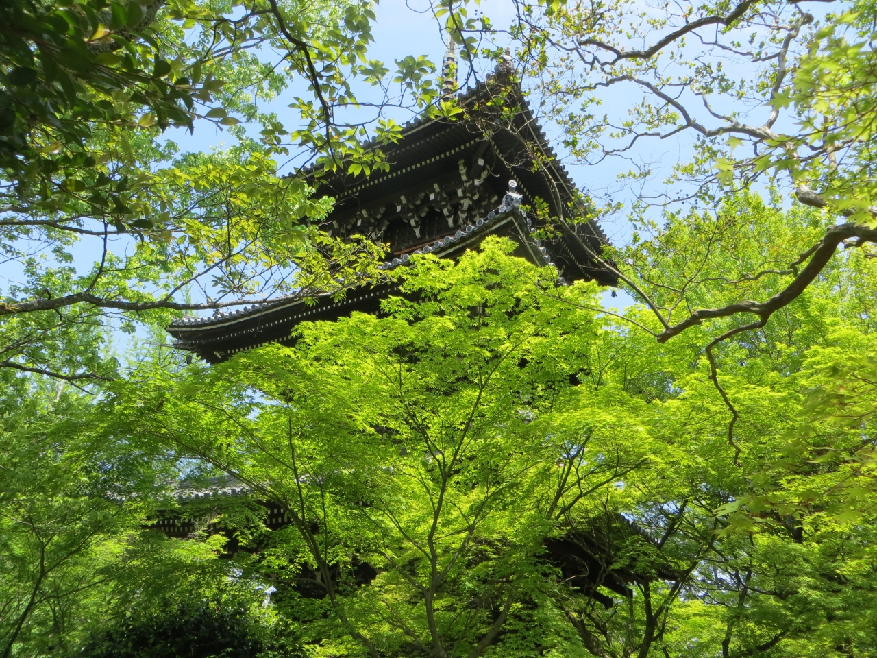 紅葉の名所として有名な真如堂(真正極楽寺)ですが、新緑もまた美しいはずと出かけてみました。金戒光明寺の会津藩墓地の前を通り北へ少し進むと真如堂の敷地に入ります。観光客はほとんどおらず境内は静かでした。秋に赤く染まっていたモミジはそのまま緑色になっていて美しい限りでした。バス停の真如堂で降りるとものすごい上り坂になっているので金戒光明寺経由の方が楽です。