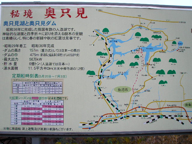 奥只見湖は只見川をせきとめて作られた人造湖で、奥只見ダムでも知られる紅葉の名所だ。紅葉シーズンには湖畔が深紅に染まり、遊覧船で湖上からその美しい風景を見ることできる。5月下旬~11月上旬のシーズン中は、新潟側から尾瀬に向かう唯一のルートで、他にも奥只見湖周遊コースや外輪船で銀山平へも行ける。